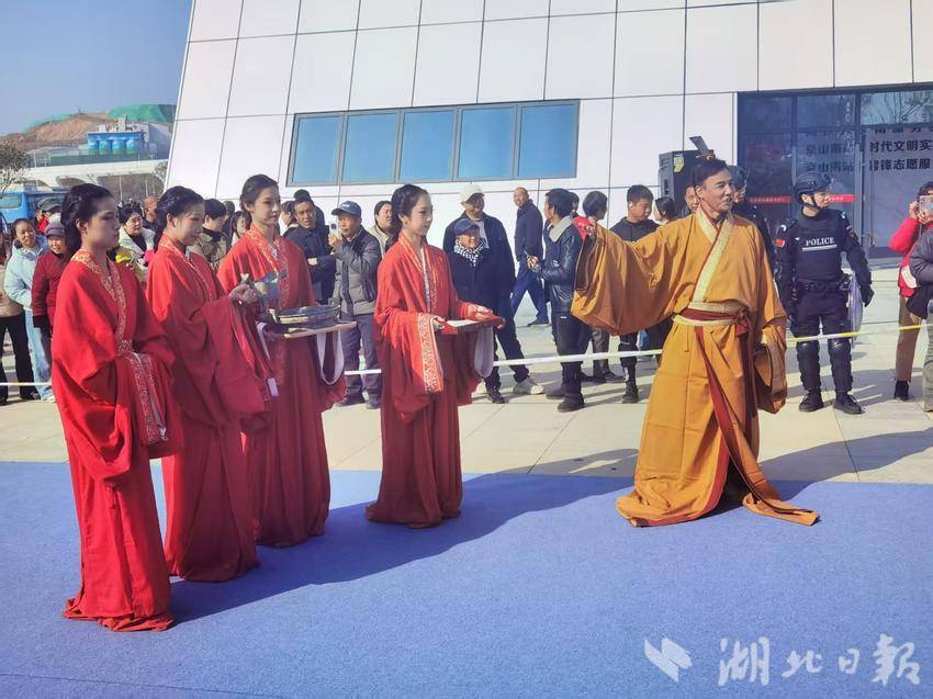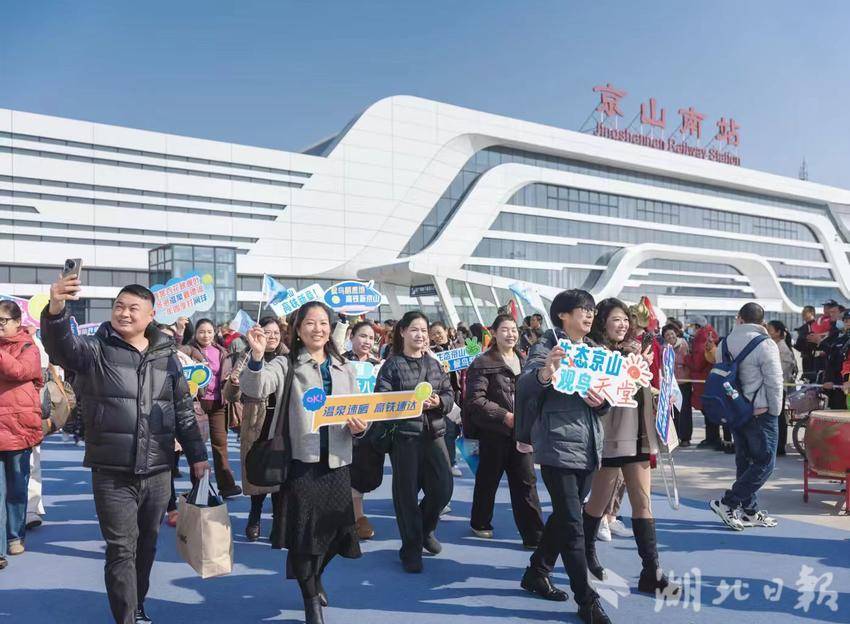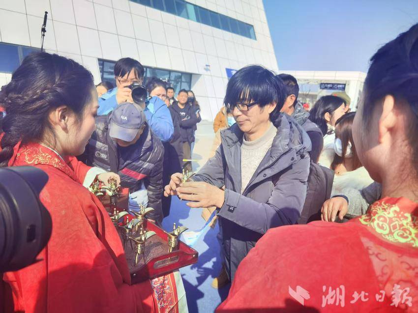 当天上午,冬日的京山高铁南站暖阳高照,中心广场人头攒动,龙狮飞舞、古风快闪、网球健身操、绿林好汉列队迎宾等文化节目轮番上演,现场群众争相参与,热情互动,曾侯偕芈克着盛装华服,为首批乘坐高铁抵达京山的旅客行“沃盥之礼”,斟美酒,送祝福,拍合影。全方位展示了京山千年历史文化的厚重底蕴及今日城市发展的新魅力。