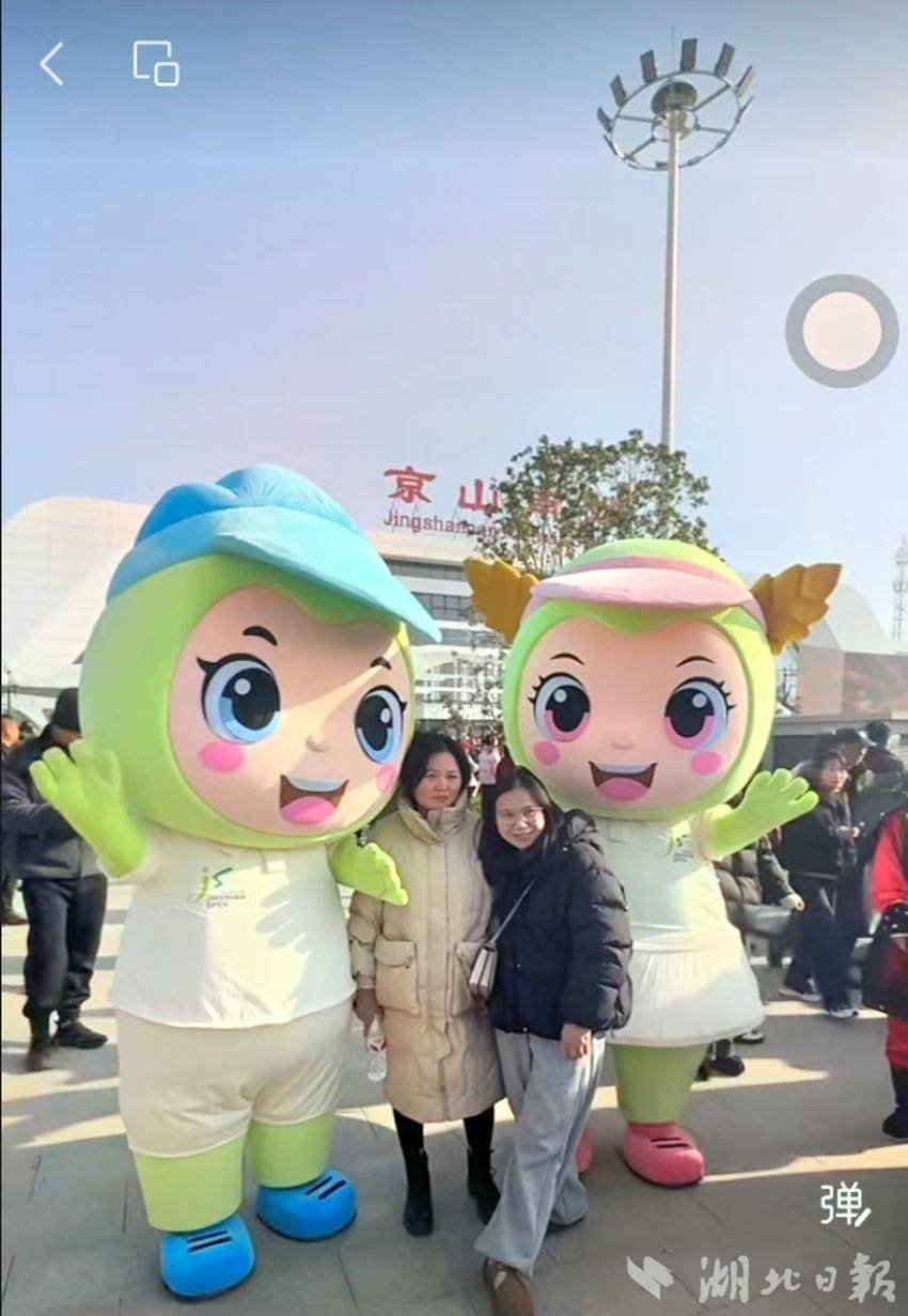 旅客与京山网球公开赛吉祥物京京、闪闪合影留念