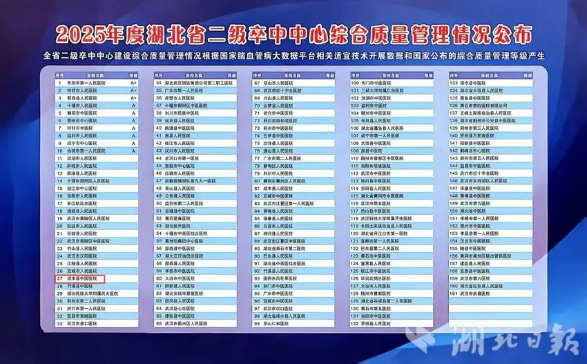 湖北日报讯(通讯员吴欢、曹征服、周雪艳)日前,湖北省脑卒中防治中心办公室发布公告,咸丰县中医医院卒中中心再次通过省级卒中中心认证,并在全省二级卒中中心综合质量管理排名中获得第27名的优异成绩,位列恩施地区同级卒中中心首位,标志着该院脑卒中救治能力与综合管理水平迈上新台阶。