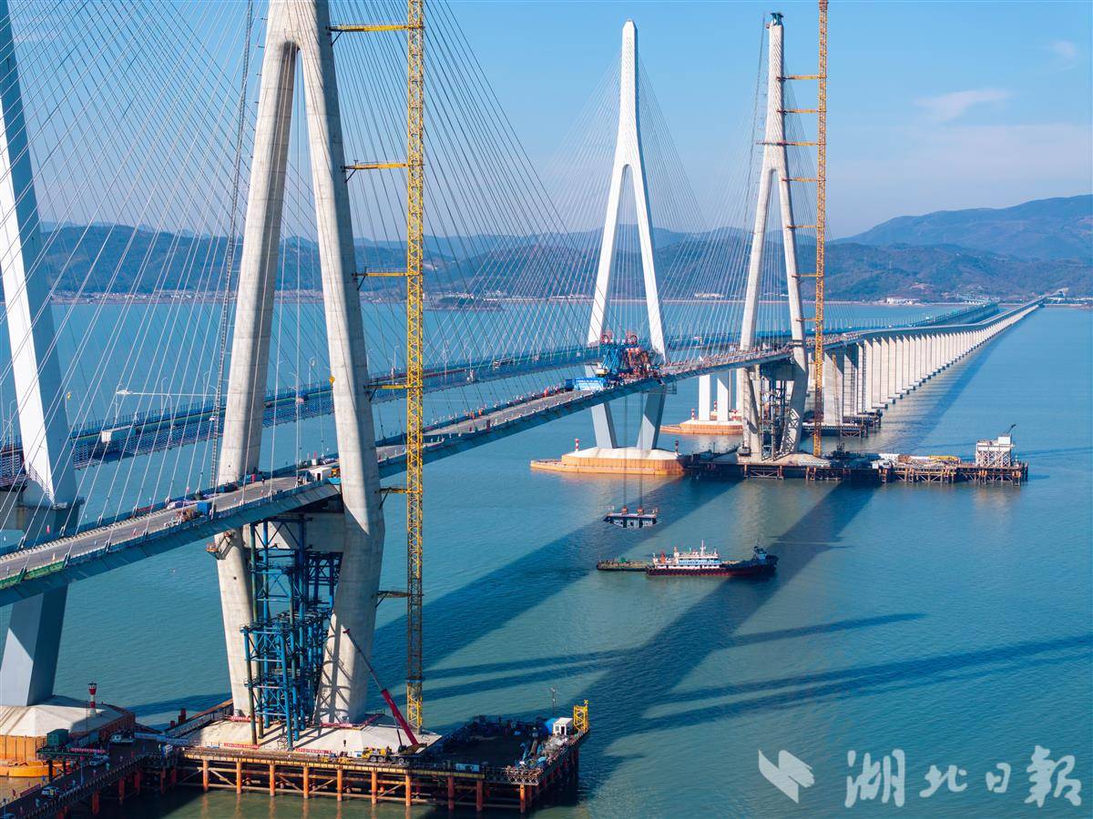 针对海上复杂多变的气候环境、高空强风及邻近既有桥梁的施工限制难题,建设团队采用了可视化动态监测系统,通过500多个传感器24小时不间断监测主塔应力、位移等指标,实现毫米级精准施工。