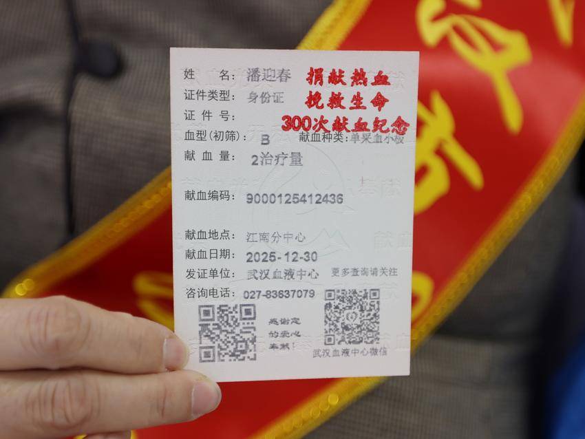 湖北日报讯(记者刘申)12月30日上午,武汉血液中心江南分中心,武汉大学历史学院教授、博士生导师潘迎春静静地躺在献血椅上,神情舒展,面带微笑。鲜红的血液从她的左臂缓缓流出——这是她21年来的第300次无偿献血。