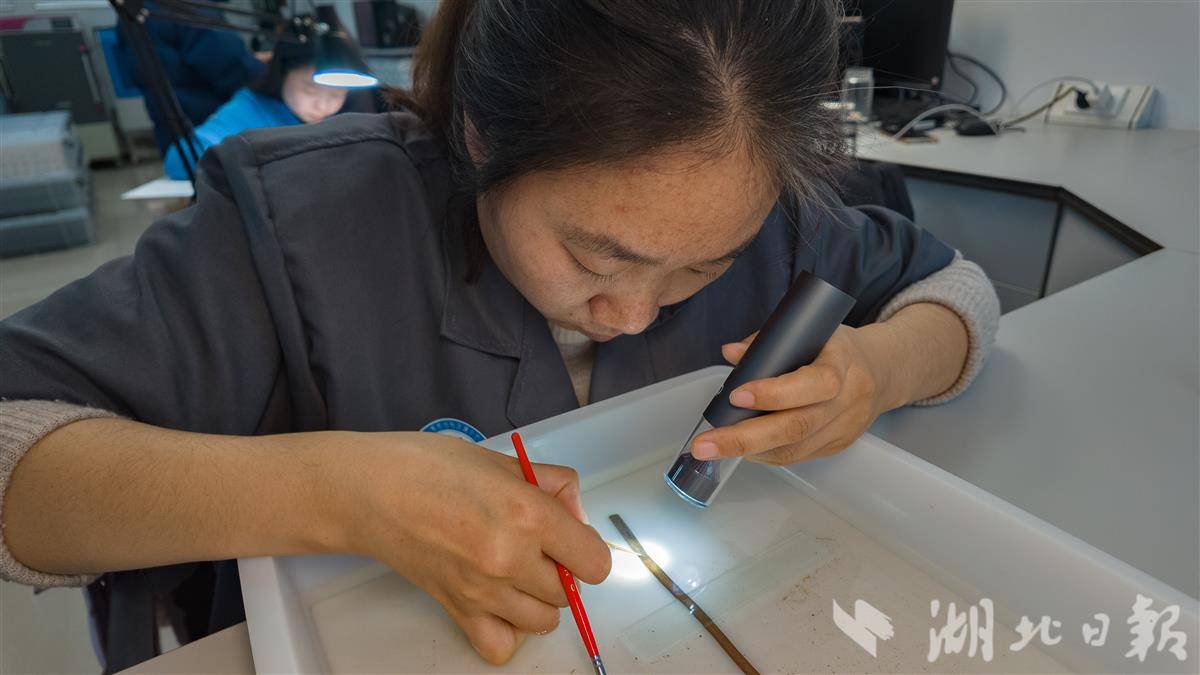 12月23日,记者走进荆州文物保护中心“荆州简”修复现场,只见数位文物修复工作者正俯身案前,借助放大镜小心翼翼地对一批王家嘴出土的简牍进行修复处理。这些沉睡地下两千余年、出土已约六年的珍贵文物,正在修复师的妙手中逐步褪去岁月尘埃,等待重焕历史光彩。目前,该所库存待处理的“荆州简”已超过万枚,修复工作正有序推进。