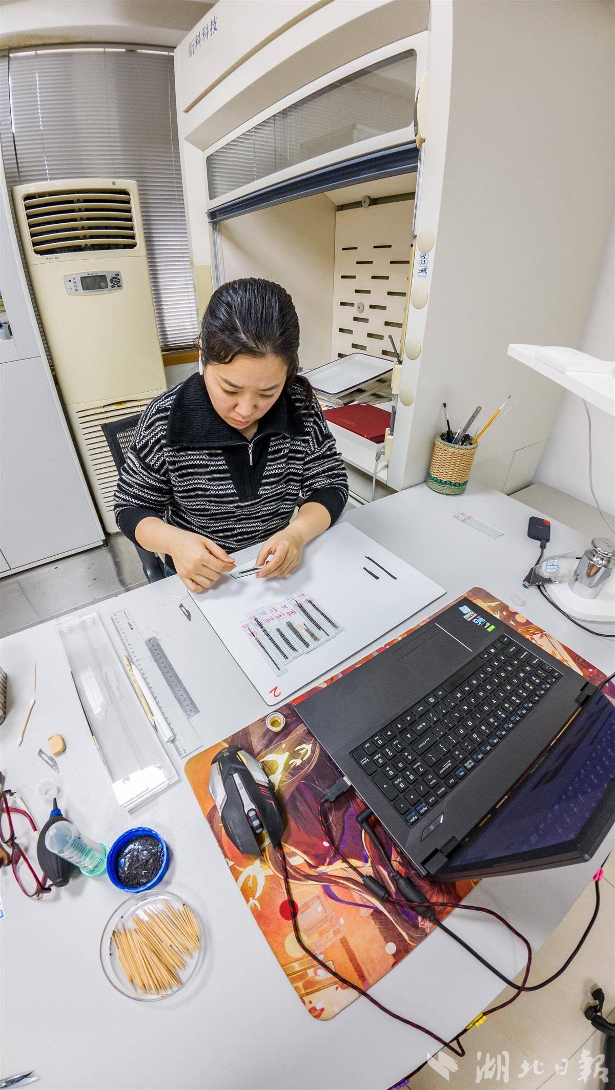荆州文物保护中心简牍工作室工作人员准备扫描竹简上的文字。