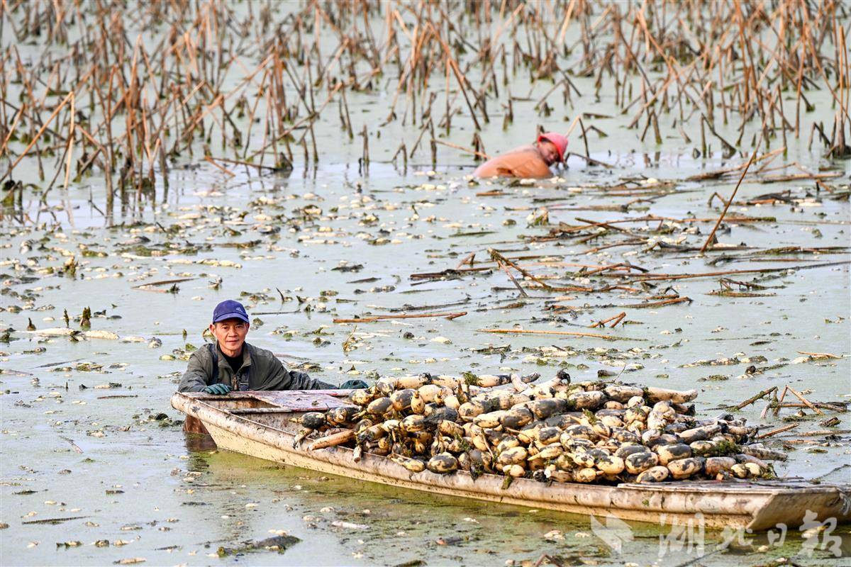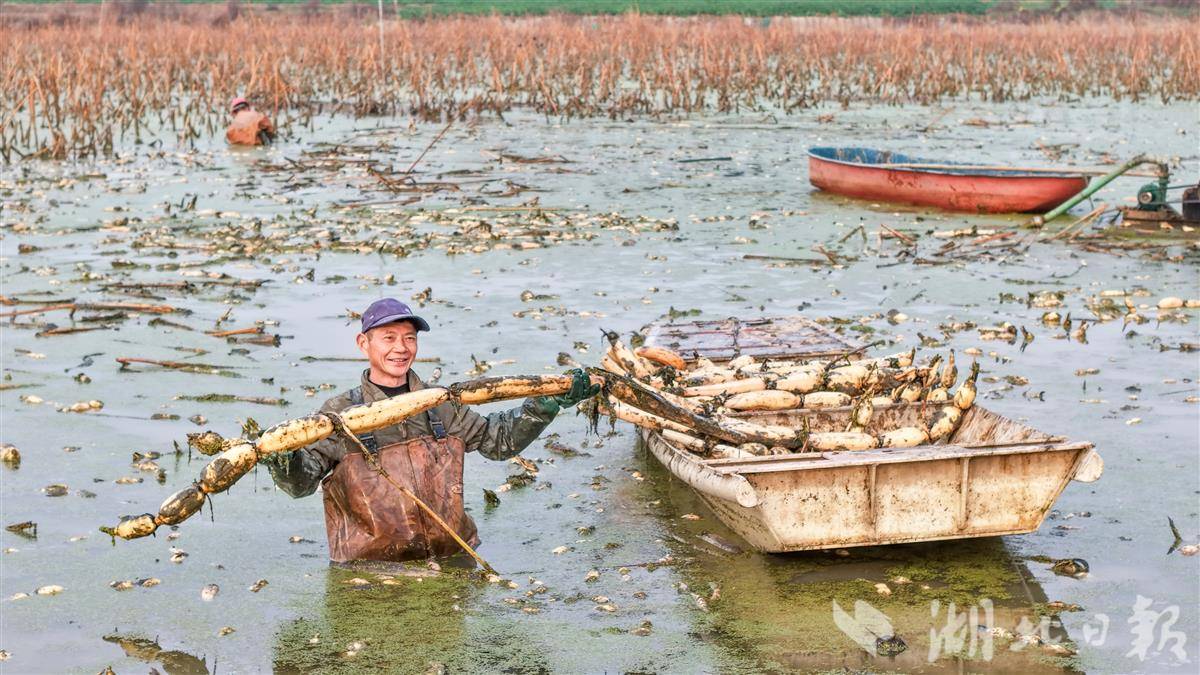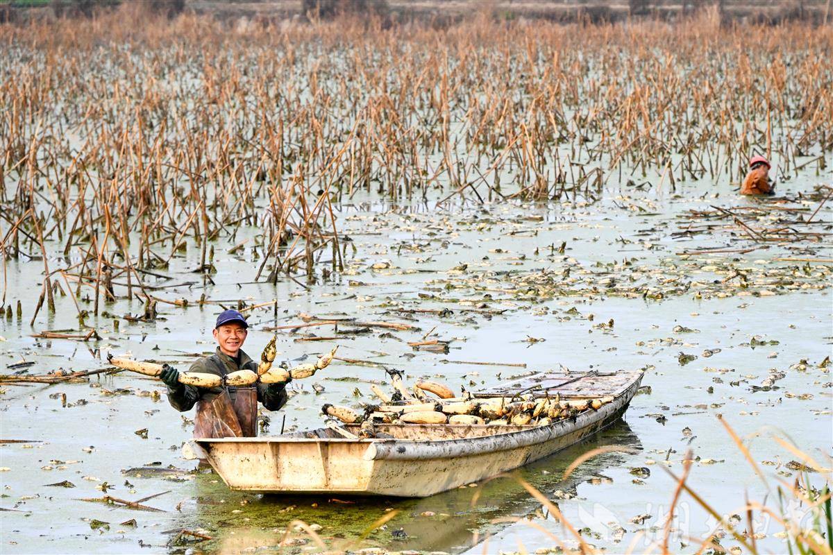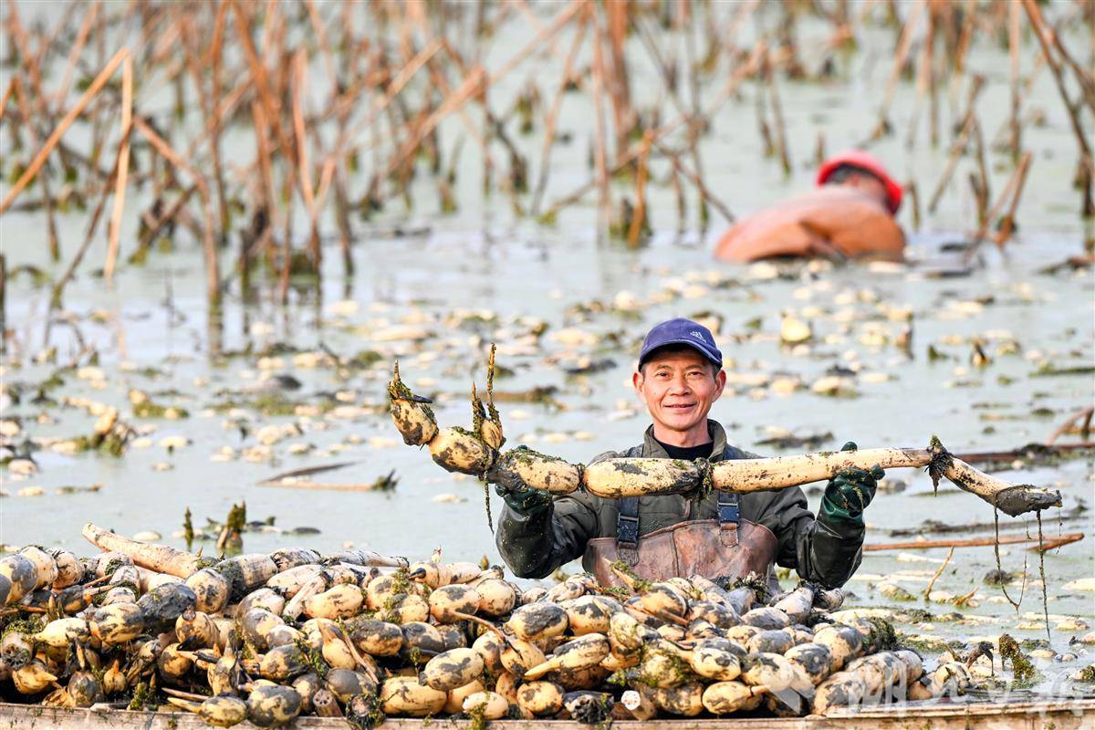 12月30日,在黄冈市浠水县策湖莲藕种植基地,藕农采收、分拣、装运鲜藕,供应冬日市场。