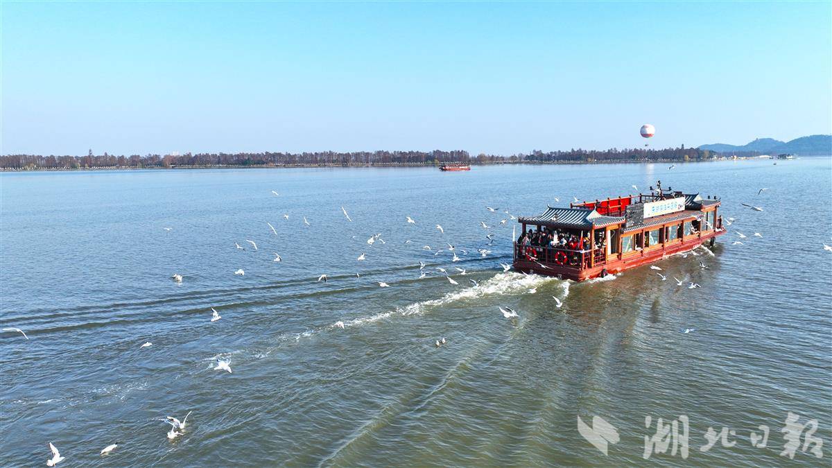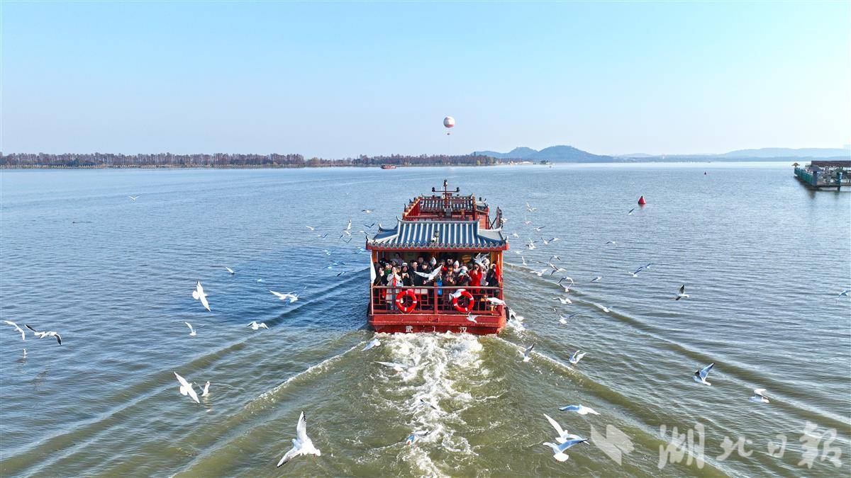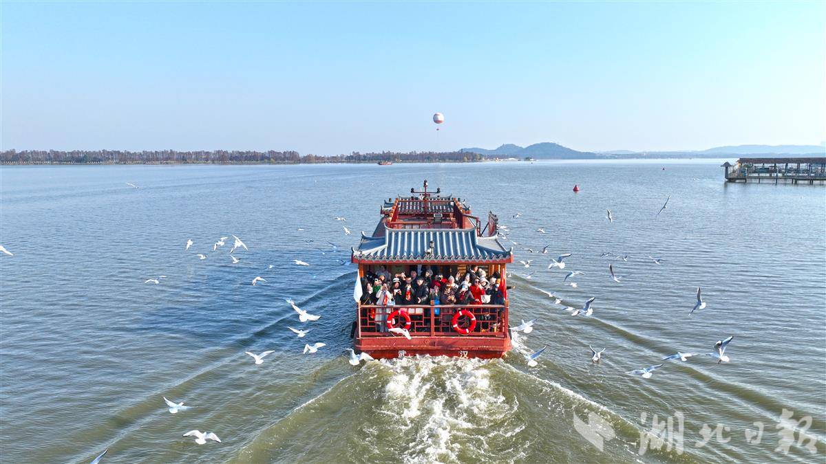 12月26日,武汉东湖游船码头,数百只红嘴鸥紧随船尾盘旋、俯冲,鸣叫声此起彼伏,形成“海鸥伴飞”的景观。