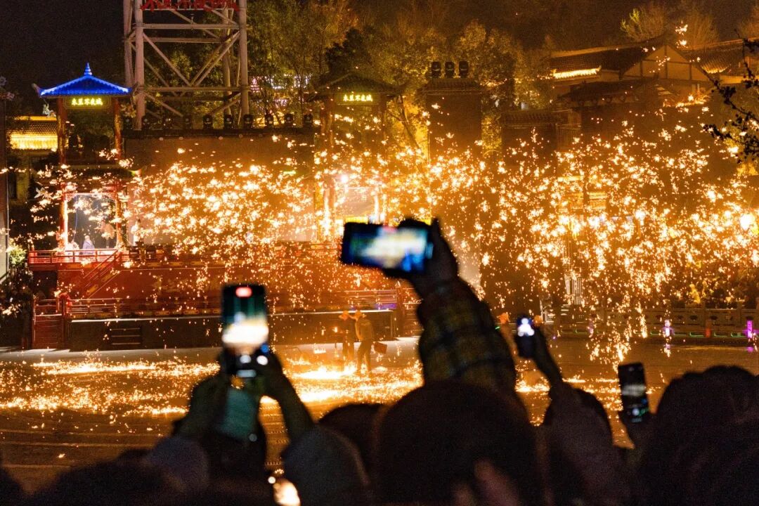 玩法丨传统非遗技艺“打铁花”与潮流音乐派对结合,现场可参与篝火互动,观看铁花如星雨洒落,体验“火树银花不夜天”的震撼景象。