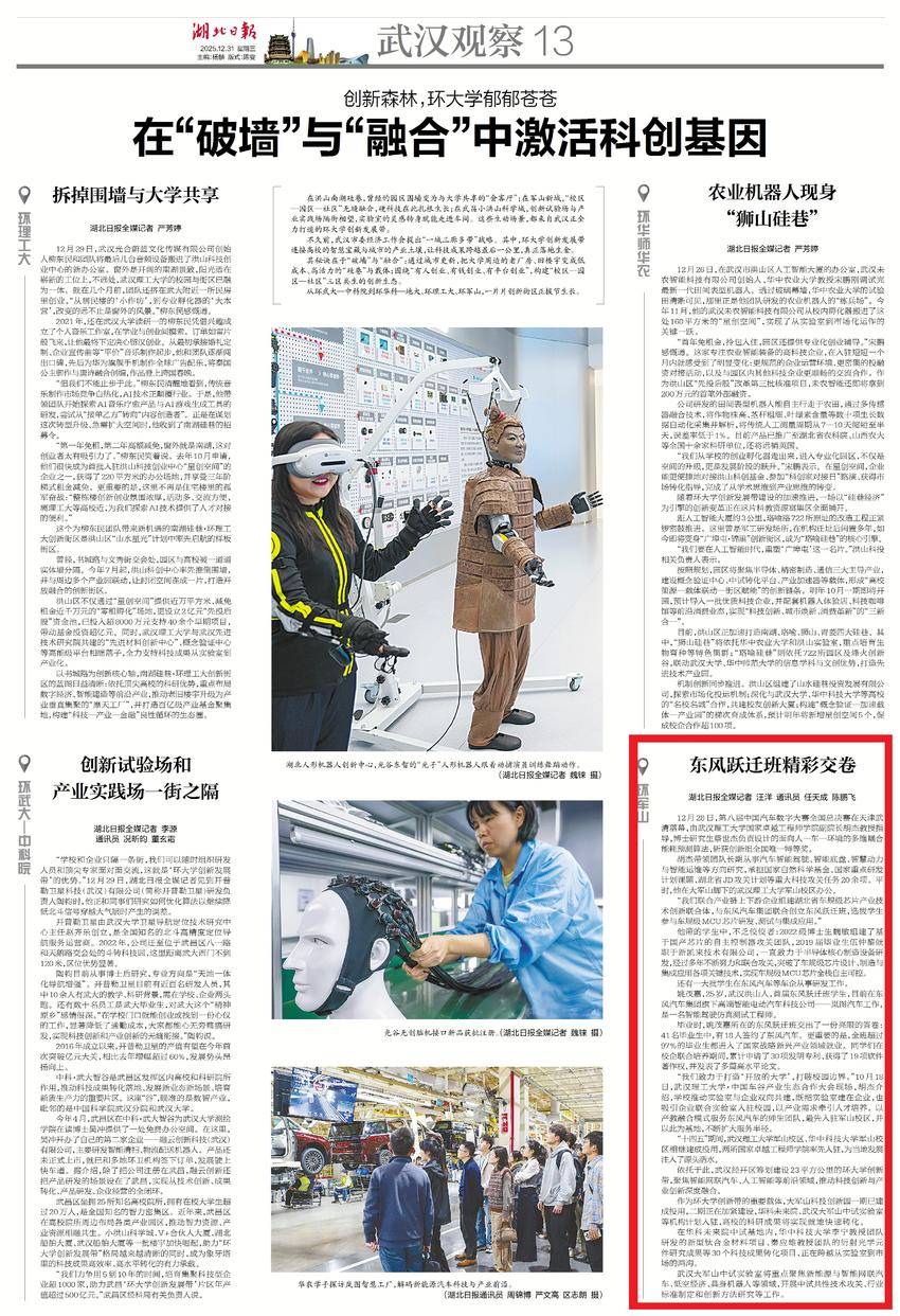 2025年12月31日,湖北日报13版深度报道武汉环大学创新发展带,《环军山 东风跃迁班精彩交卷》是核心内容之一。