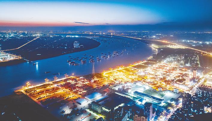 灯火通明的武汉阳逻港一片繁忙。(湖北日报全媒记者 柯皓 摄)