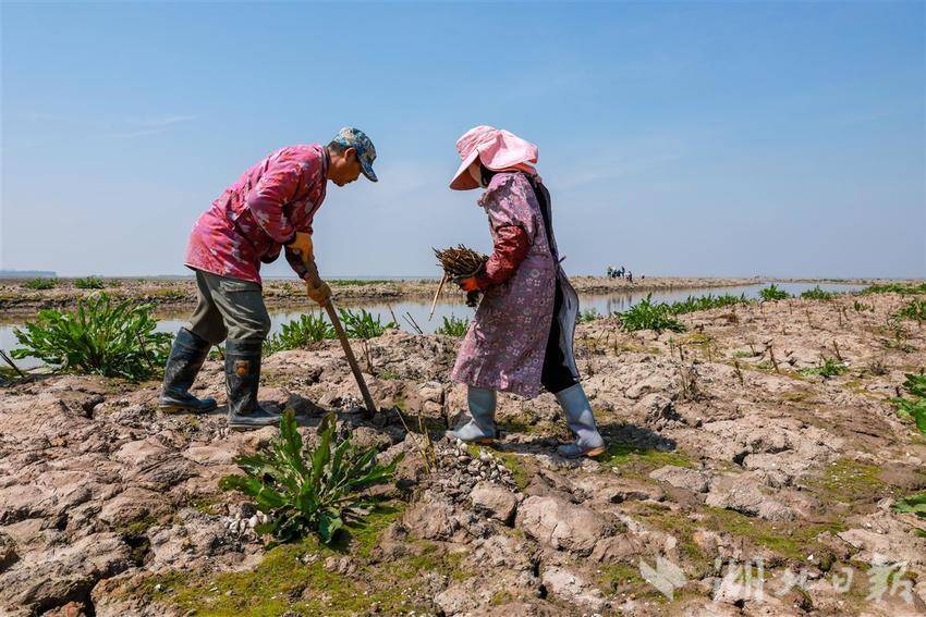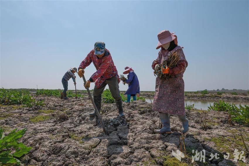 2025年3月18日,渔民在湖床上种植芦苇。