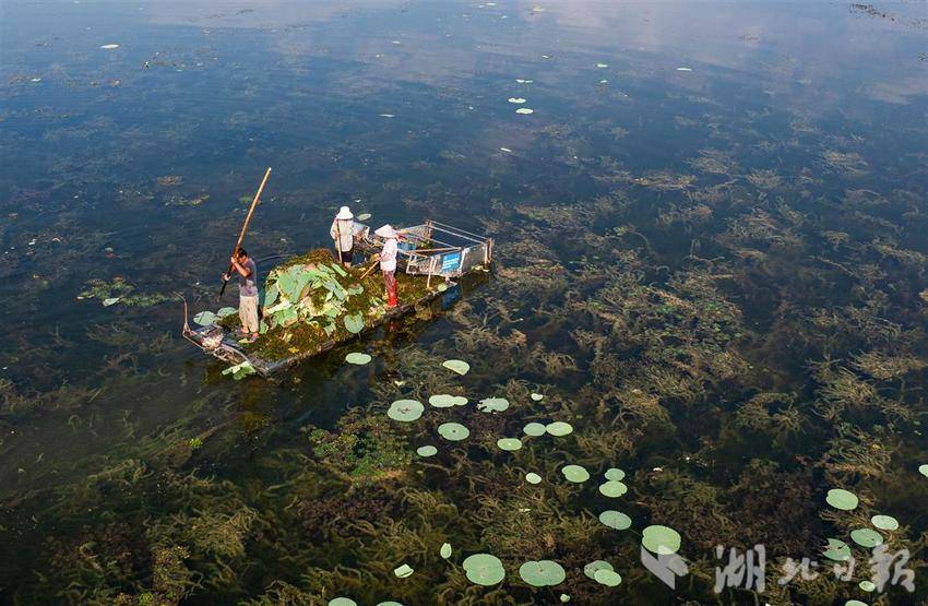 2025年8月27日,工人们在洪湖水域开展常态化巡护与清理作业,以确保阳光能够充分照射到湖底,为水生植物生长创造适宜环境。