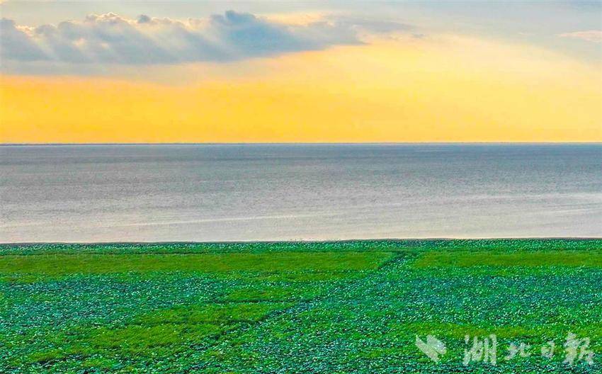 2025年8月28日,傍晚的洪湖波光粼粼、荷叶田田、晚霞灿灿,“梦幻三色”,唯美浪漫。