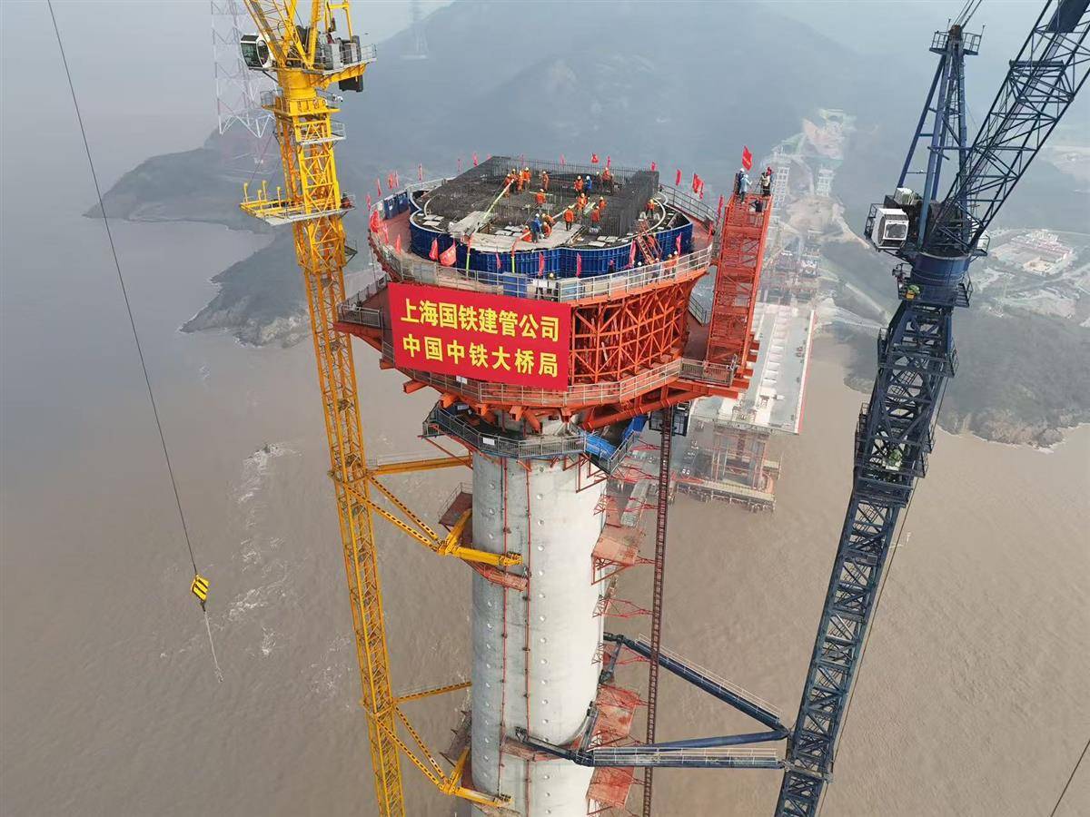 湖北日报讯(记者刘柳、张灿、通讯员周威、邵长彬、晋旭俊、郭少山、张高峰)12月30日,随着最后一方混凝土从输送泵车中缓缓注入模板,由在鄂央企中铁大桥院设计、中铁大桥局承建的甬舟铁路西堠门公铁两用大桥5号主塔封顶,工期比内控计划提前3个月,这也是甬舟铁路全线首座封顶的桥梁主塔。294米高的主塔,相当于100层楼房的高度,刷新了世界海中桥梁主塔高度的新纪录。