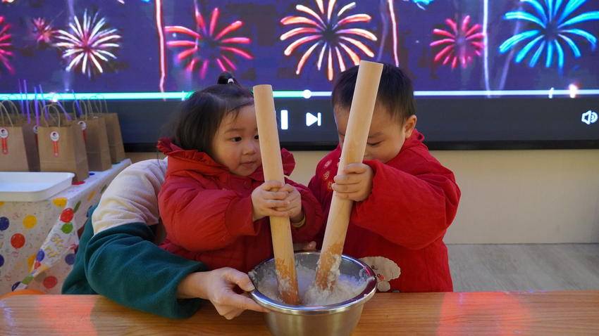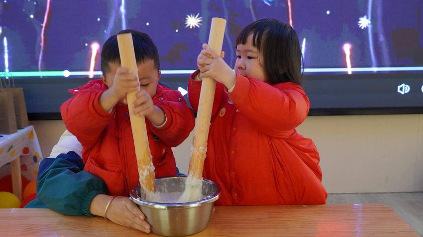 最让孩子们着迷的,当数“打糍粑”手工食趣坊环节。老师将蒸熟的糯米倒进盆里,大手握小手地教大家握着擀面杖,一起合力反复捶打,孩子们的欢笑声此起彼伏。捶好糍粑后,老师带着大家把软糯的糍粑揉成一个个小圆团,分装到小碗里。大家你一口我一口地品尝着香甜软糯的糍粑,整个园区里都洋溢着热闹又温馨的气息。