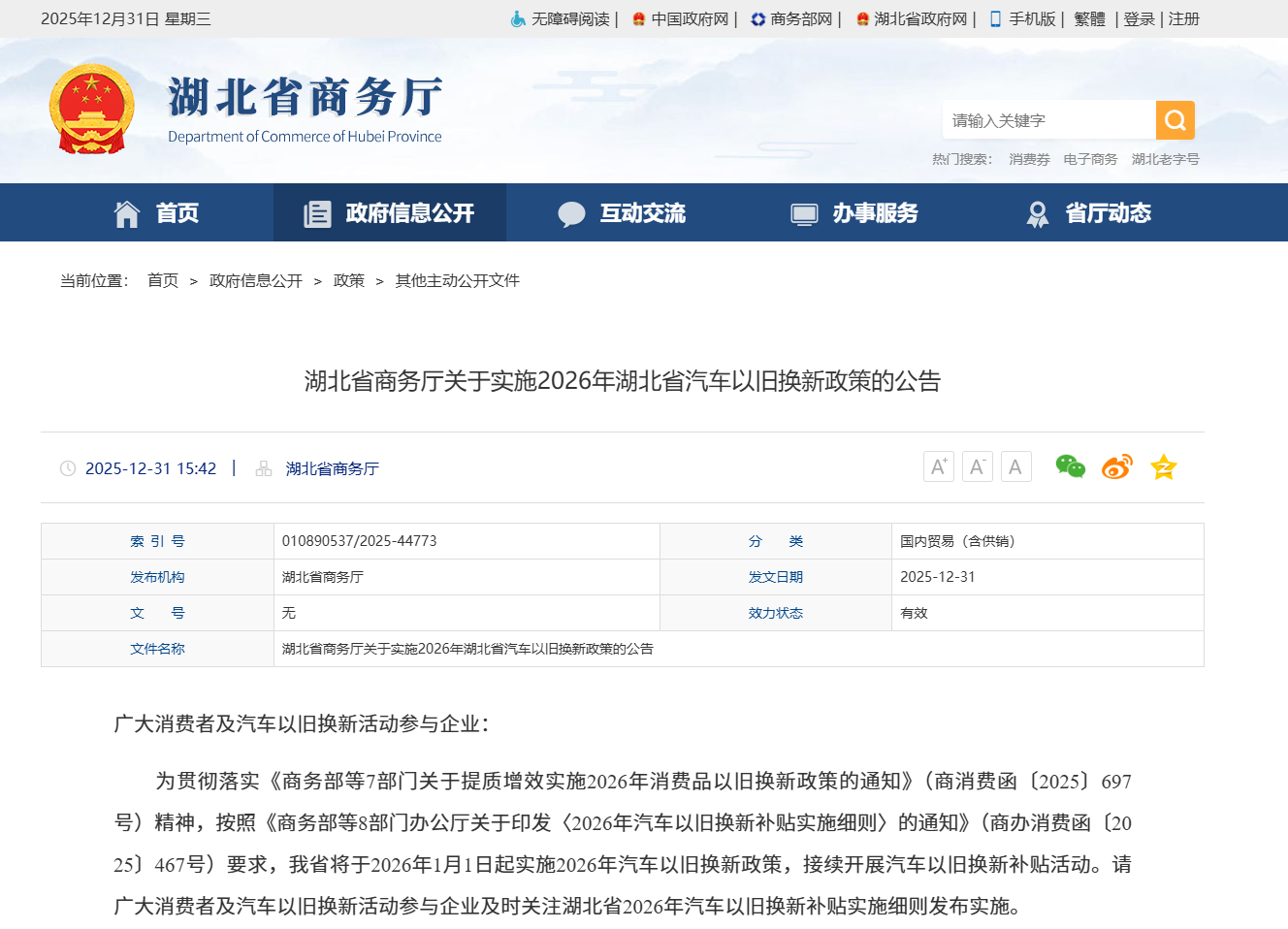 12月31日,省商务厅官网发布《关于实施2026年湖北省汽车以旧换新政策的公告》称,我省将于2026年1月1日起实施2026年汽车以旧换新政策,接续开展汽车以旧换新补贴活动。