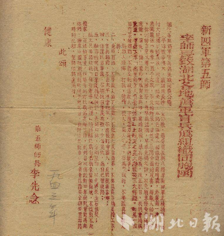 1943年,新四军第五师师长李先念致湖北各地伪军官兵、伪组织同胞函(湖北省档案馆藏)。