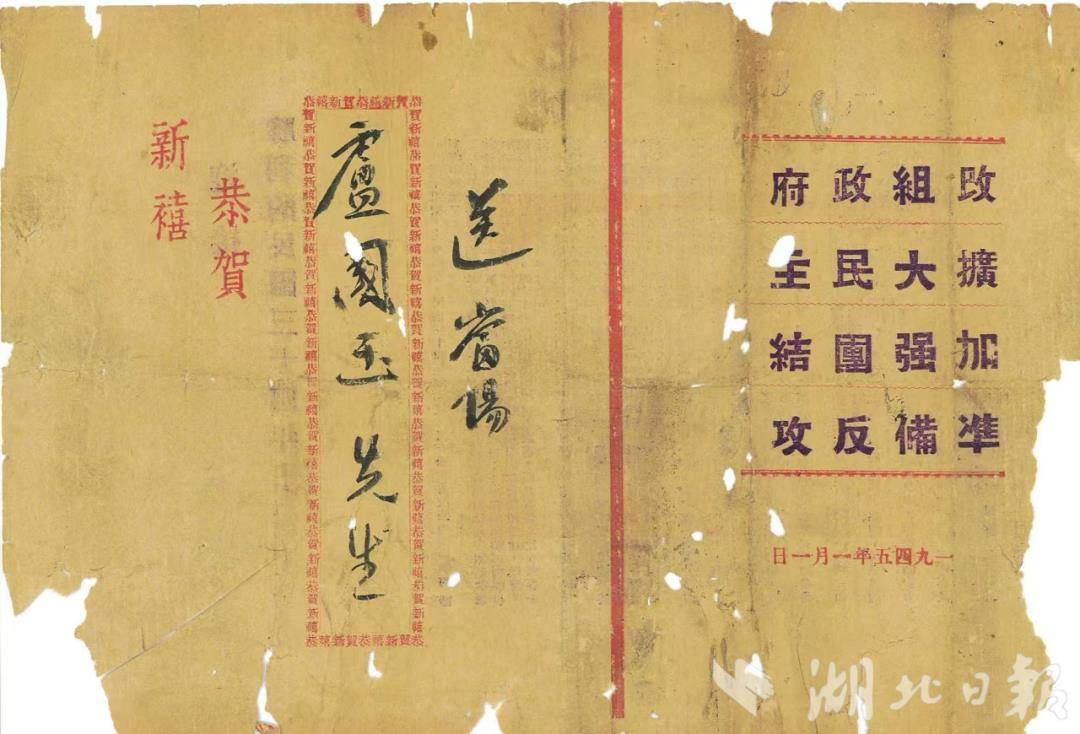这是1945年元旦,新四军第五师师长李先念与郑位三、陈少敏、任质斌、许子威等鄂豫边区领导人,联名送给当阳开明士绅卢国玉的新年贺礼。