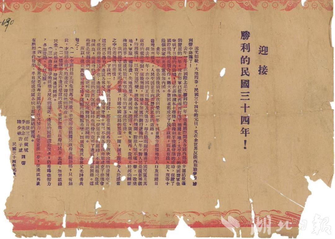 反面印有题为“迎接胜利的民国三十四年!”的元旦贺词。近千字的贺词,清晰地记述了当时国际国内反法西斯战争形势,并提出四点希望,鼓励大家再接再厉,向着共同的目标奋斗。落款为:郑位三、李先念、陈少敏、任质斌、许子威同启,民国三十四年元旦。