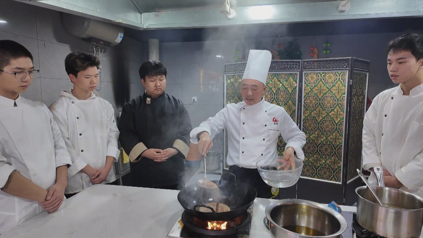 “炒糖色要少油小火慢炒,待大泡转小泡呈琥珀色时加油加水,再熬干油水才能保证色泽醇厚,炒过了则苦、炒嫩了则甜,火候至关重要。”工作室的操作间里,全国劳动模范、工作室领衔人张彬一边向年轻的厨师们演示、讲解,一边详解关键步骤。