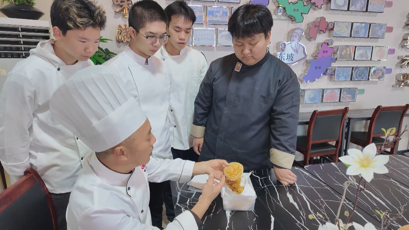 “很多人误以为东坡肉要用五层五花肉,其实两层五花肉(一层瘦肉一层肥肉,肥多瘦少)最佳,避免烧制后脱层变形。”张彬说,东坡肉选肉环节暗藏门道。为解决东坡肉在制作过程中容易发生“肥腻”“柴硬”问题这一痛点,工作室创新采用三次脱油工艺:蒸制、炒制、再蒸制,同时加入啤酒和山楂软化肉质,最终实现“肥而不腻,瘦而不柴”的口感。