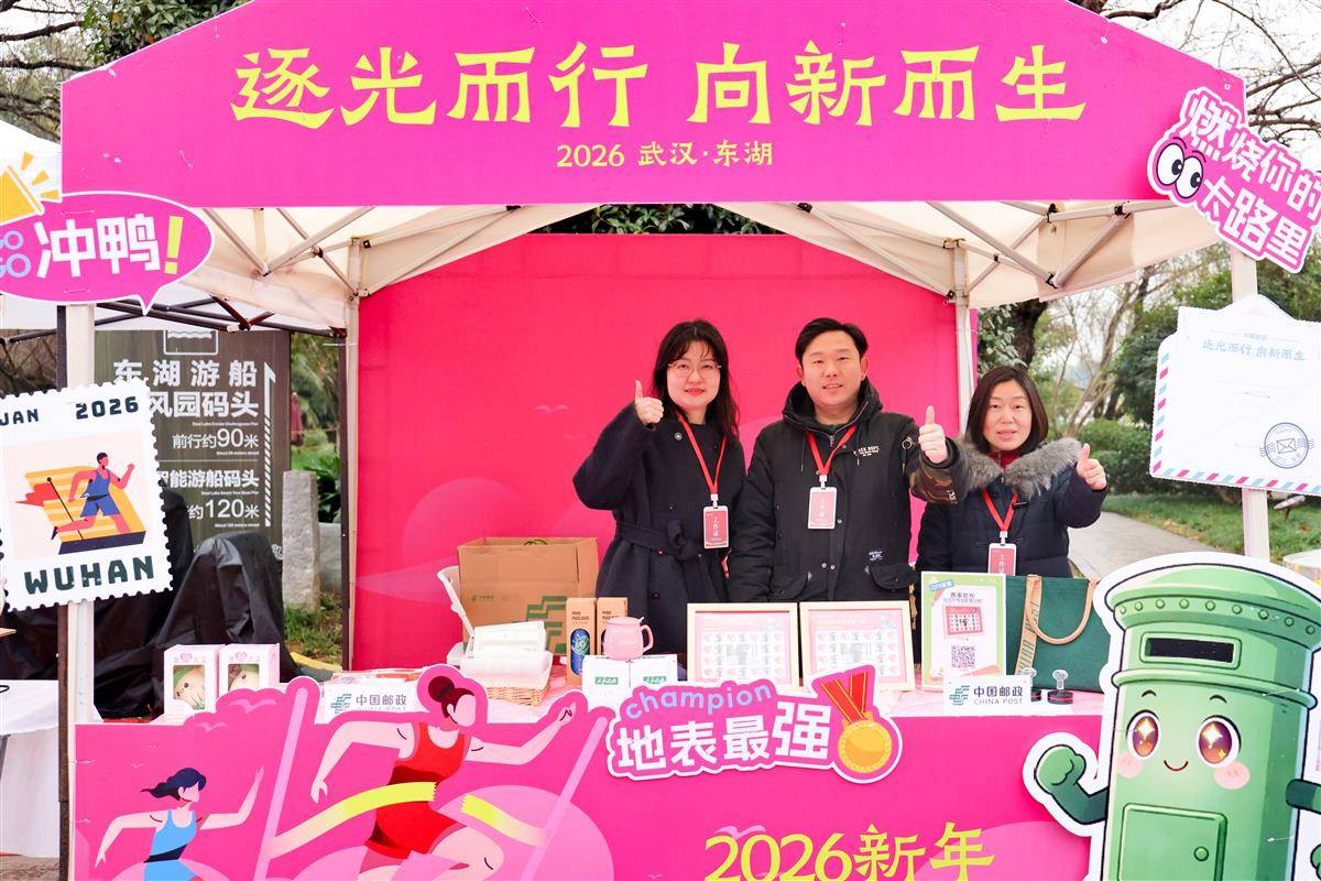 赛后,颁奖仪式在湖光序曲广场举行,但许多跑者并未离去。新设立的“新年邮局”前排起队伍,大家争相寄出盖有2026年1月1日邮戳的“新年首日封”,上面印着赛事主题“逐光而行,向新而生”。