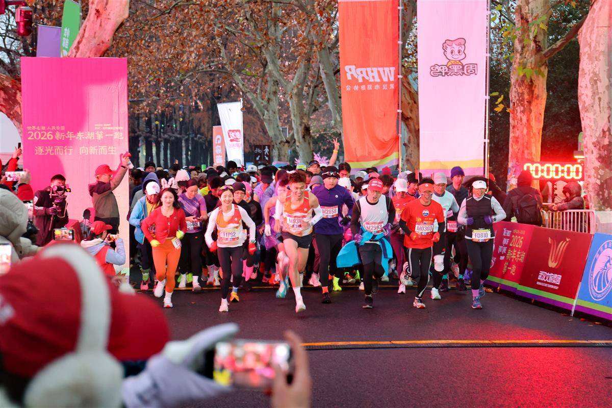 7时30分,发令枪响。人群如蓄势已久的暖流,涌向湖中道。脚步惊醒湖畔,身影划破晨雾。20.26公里的环湖线路,恰与年份数字相呼应。“一个人跑得快,但一群人一起出发,才跑得出新年的气象和心跳。”专程从郑州赶来的跑者芦晓娜告诉湖北日报全媒记者,“这是跑友们一年最好的开场。”