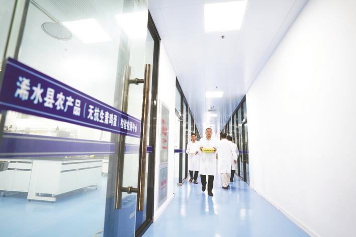 工作人员在检验检测中心对鸡蛋进行检测。(袁杰 摄)