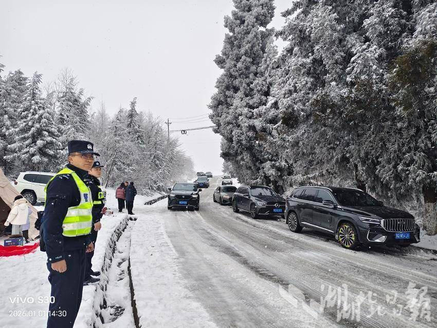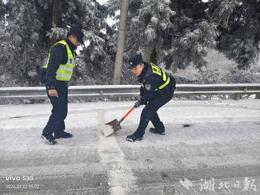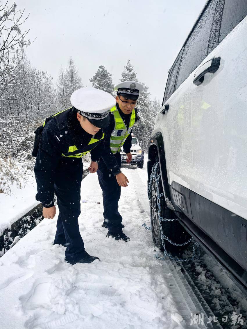 湖北日报客户端讯(通讯员 李剑飞)“您可千万不要迷信‘四驱’,这么大的雪凌,把防滑链装上才安全。”2026年1月1日,元旦,上午8点多钟,平均海拔1600米的恩施市板桥镇大山顶村,气温已低至零下,板桥派出所副所长张金星和他的同事正一遍又一遍地向来往的车辆驾驶员叮嘱,口中不停地呼出着白气。今天,已是暴雪后,他们在大山顶守护的第二天。