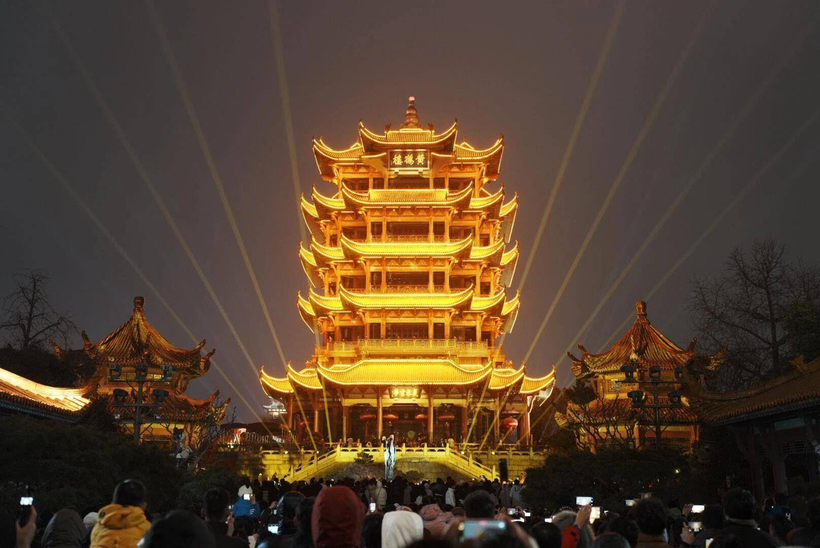黄鹤楼元旦祈福嘉年华璀璨开启,吸引大批游客。
