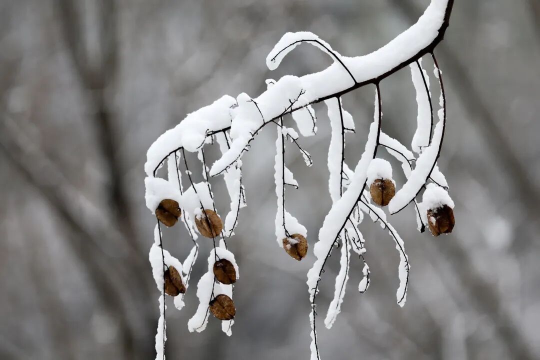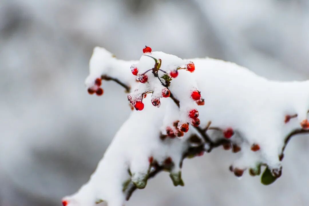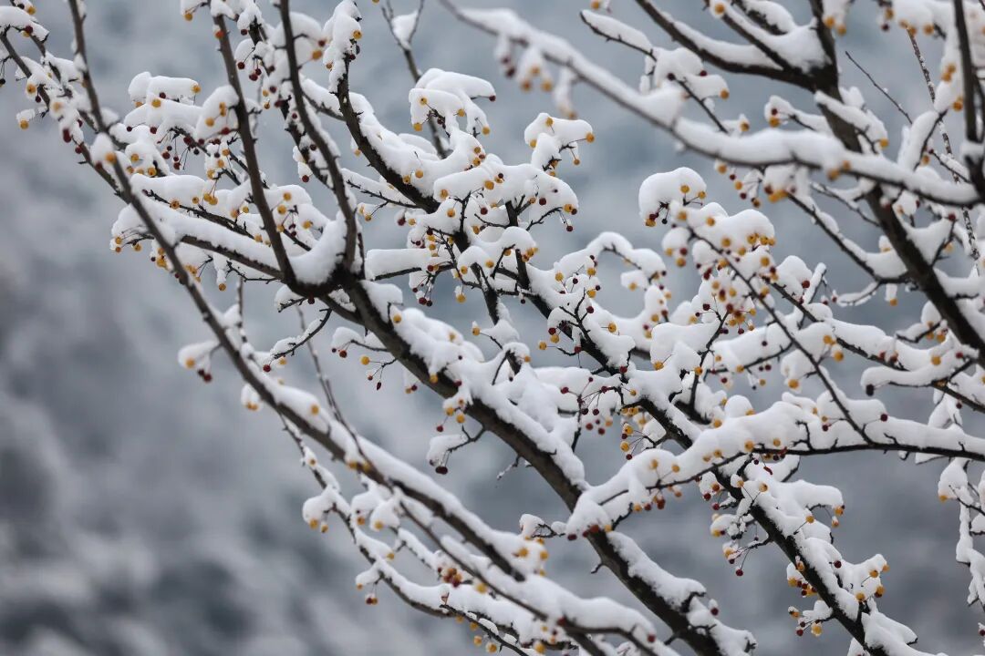 栾树枝头被雪半掩的蒴果,好似一串串素绢扎起的小小红灯笼。不畏寒的红色浆果与金黄野果,依然星星点点缀在枝头,于雪被下探头探脑,成为这静谧世界里最灵动的标点。