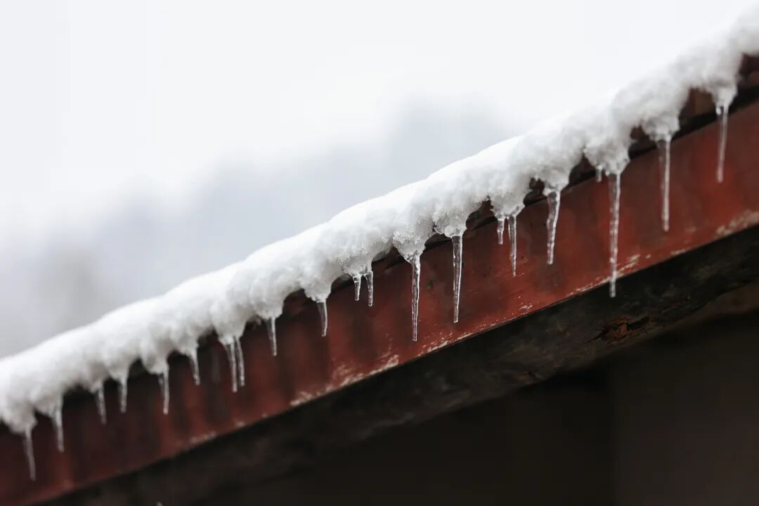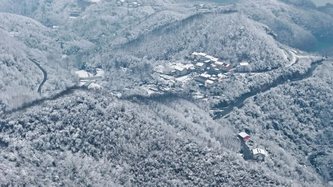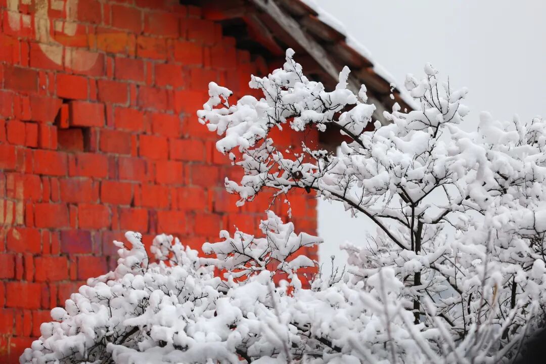 村庄静卧于群山环抱中,时间仿佛被雪滤慢了。红砖墙被积雪勾勒出轮廓,在素白中点缀着温暖的亮色,屋檐下冰凌剔透如水晶。