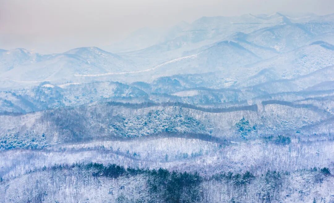 晨光中远眺,积雪并未掩盖群山本色。峰峦在雪的晕染下层次分明——向阳处洁白耀眼,背阴处则透出黛蓝与青灰的深沉。远山如黛,在薄雾中隐现,宛若天地间徐徐展开的立体画卷。