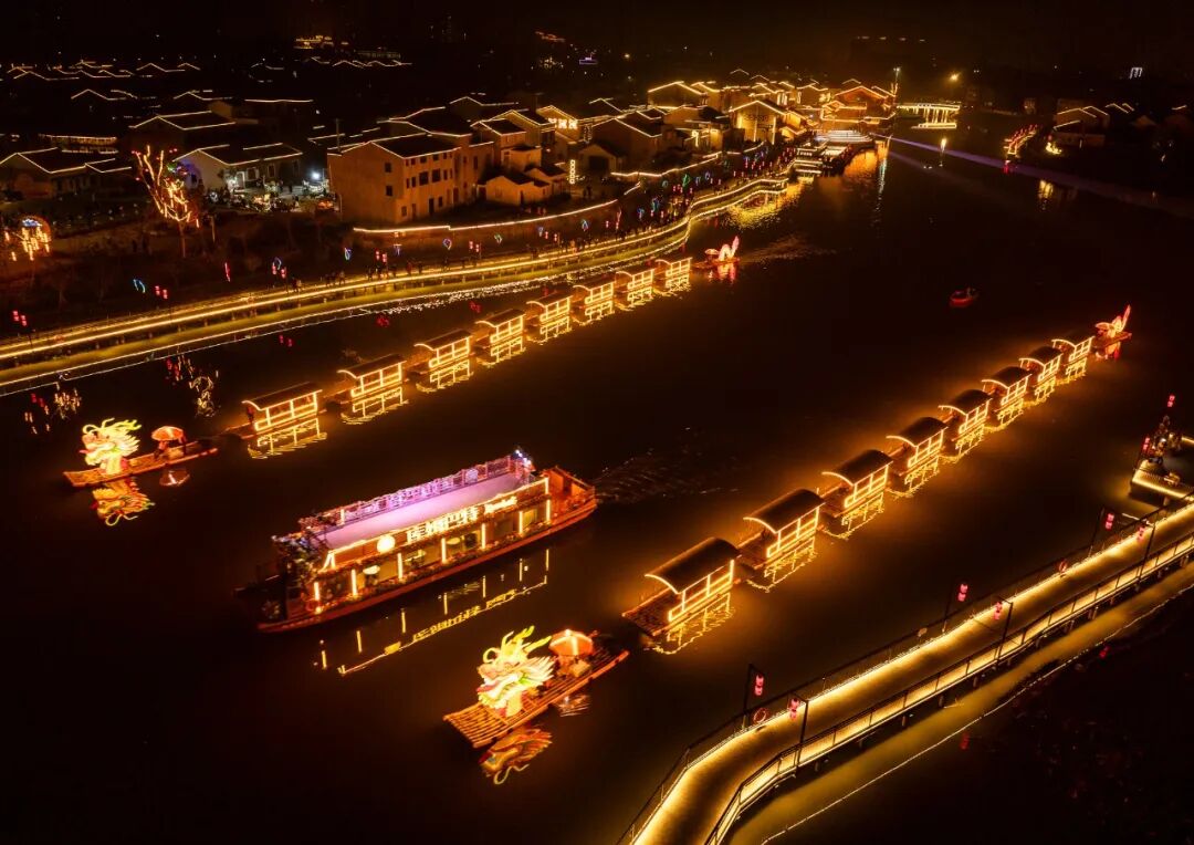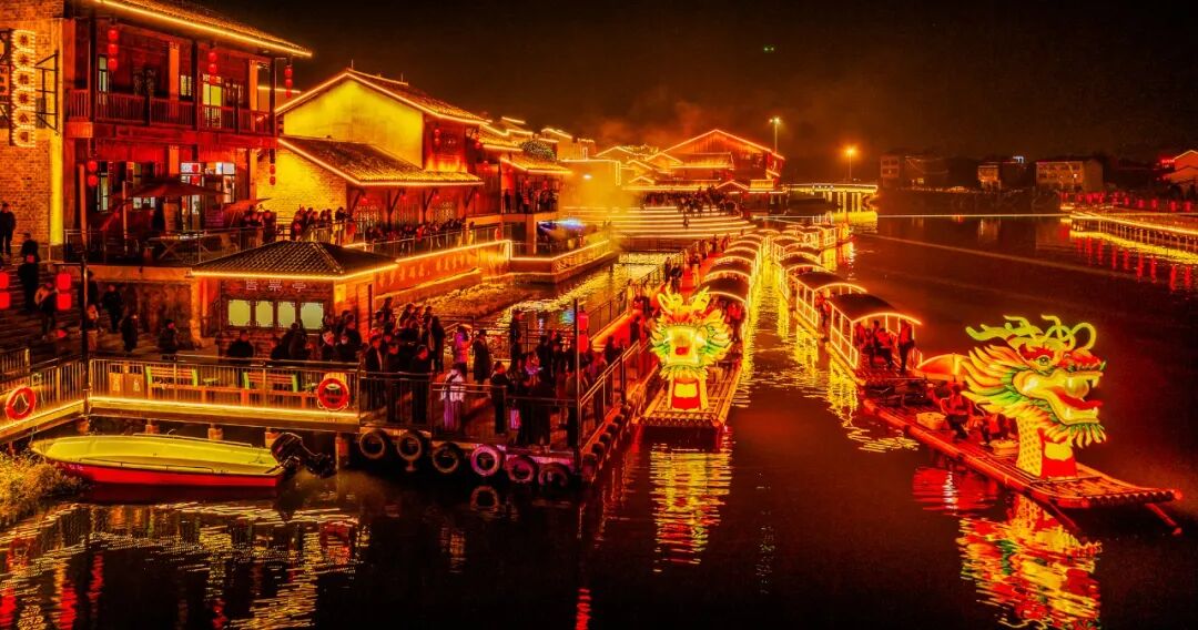 2025年12月30日,干河街道袁市村通顺河段面,两条竹筏龙舟缓缓驶出码头,灯带勾勒出龙舟轮廓,在水面灯影里泛起层层波纹。沔商代表登上竹筏,随舟而行。