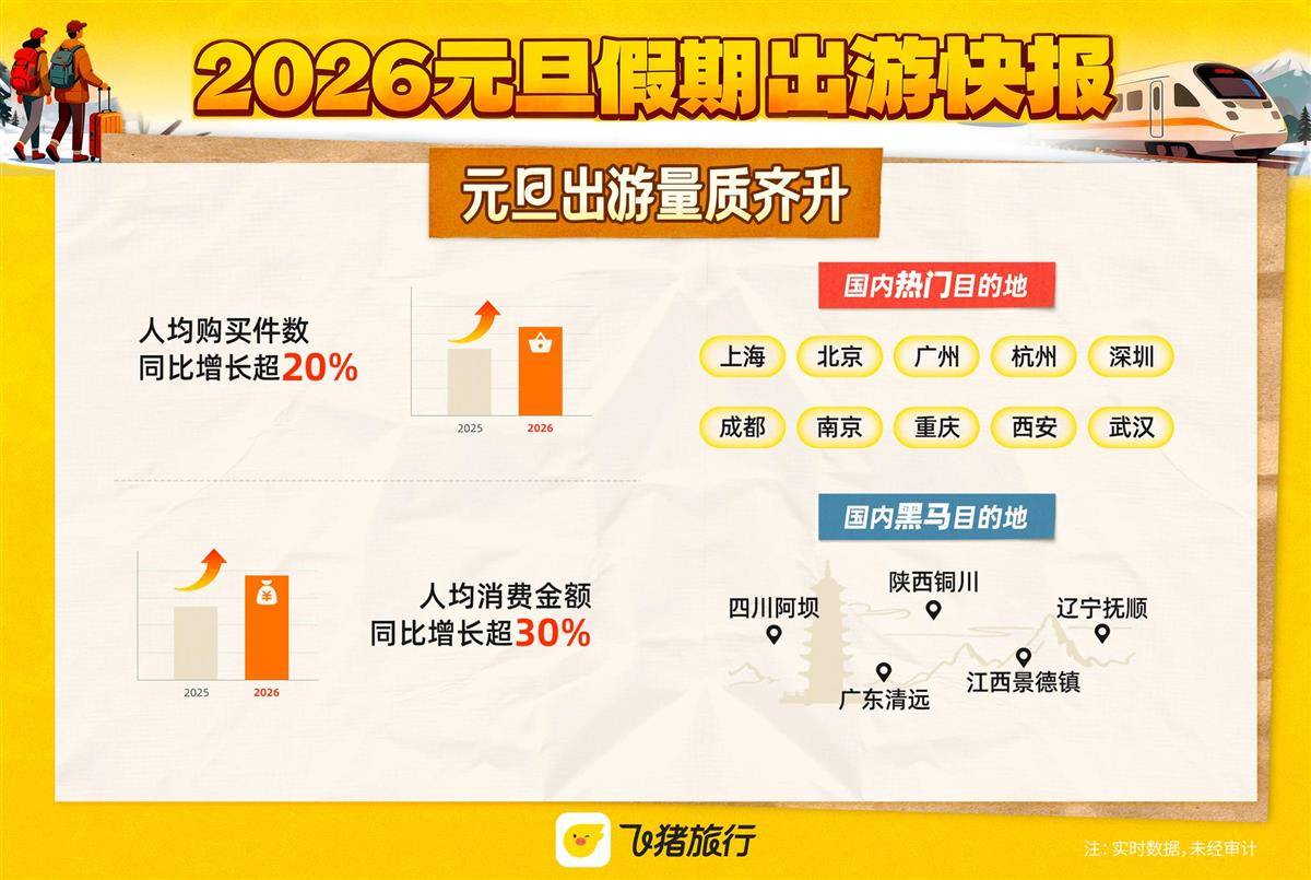 湖北日报讯(记者王理略、通讯员汪星州)得益于“请3休8”拼假攻略的带动,2026年元旦旅游市场迎来开门红。1月3日,飞猪发布《2026元旦假期出游快报》显示,消费者出游意愿与消费力同步攀升,人均购买件数、人均消费金额同比分别增长超20%、30%。元旦当天,国内酒店、目的地玩乐商品预订量更是同比劲增280%、270%。武汉入选全国十大热门目的地。