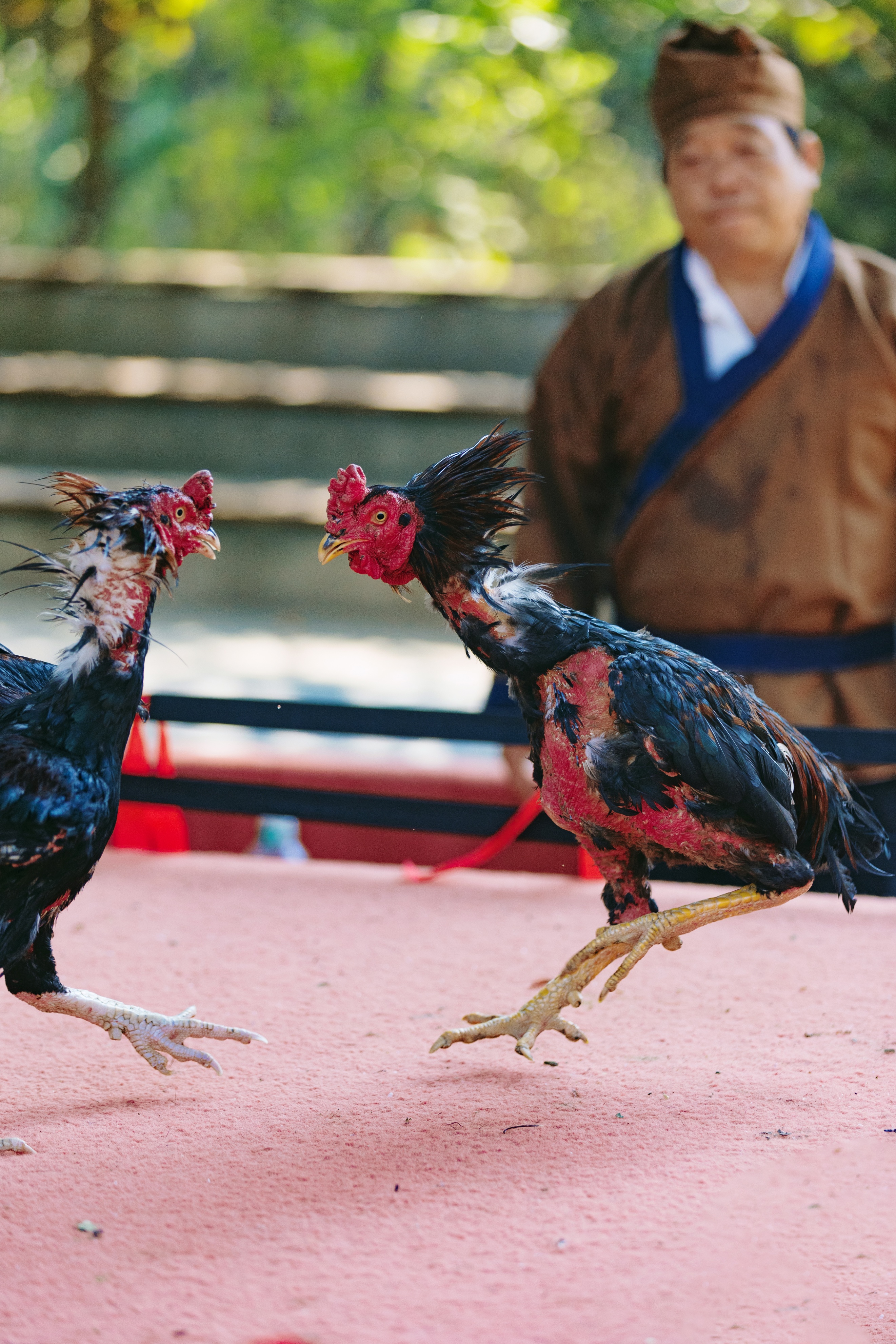 这边风景正好,那边非遗表演更是精彩不断!斗鸡赛场里,健硕的斗鸡昂首翘尾、激烈啄斗,一招一式都引得观众阵阵欢呼。