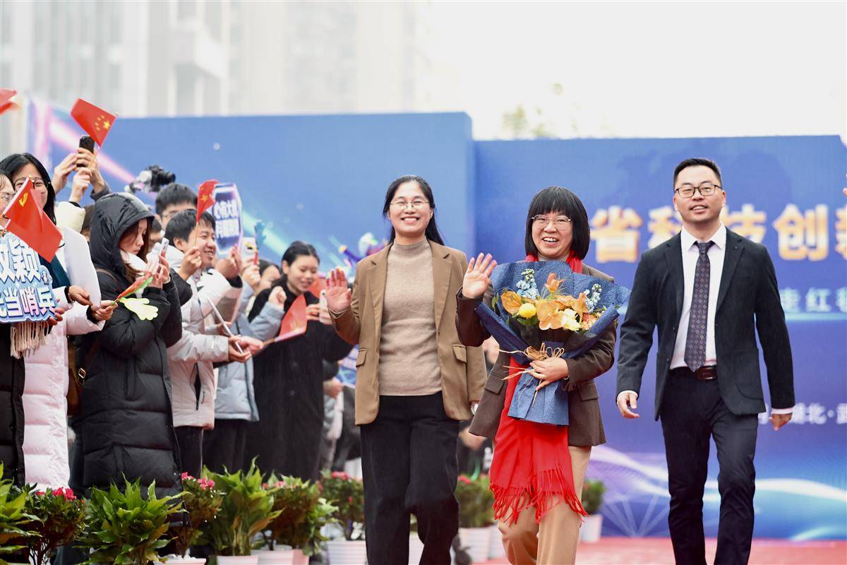 2026年1月4日,2026湖北省科技创新大会科学家走红毯现场,三峡大学教授,2025年度湖北省科学技术进步奖一等奖获得者,2025年楚天英才计划·双创团队负责人杨简携团队成员走上红毯。(湖北日报全媒记者 何宇欣 摄)