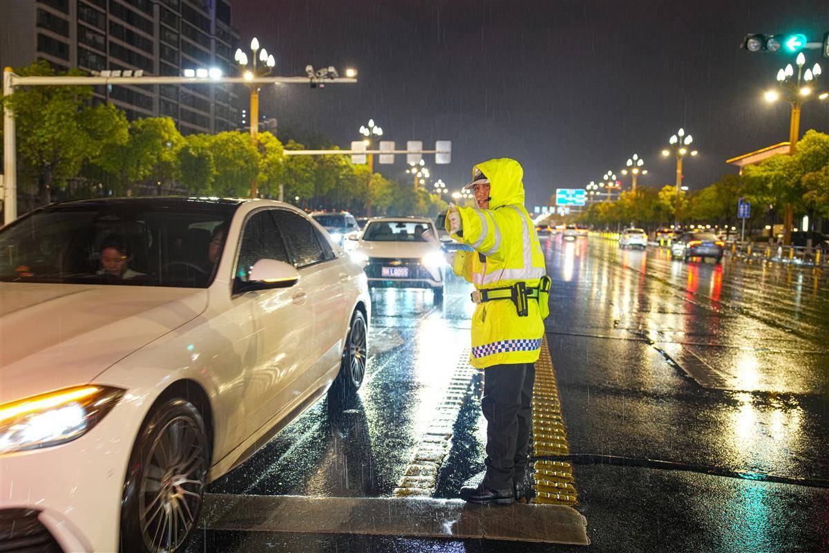 孝感警方冒雨在吾悦广场疏导交通。