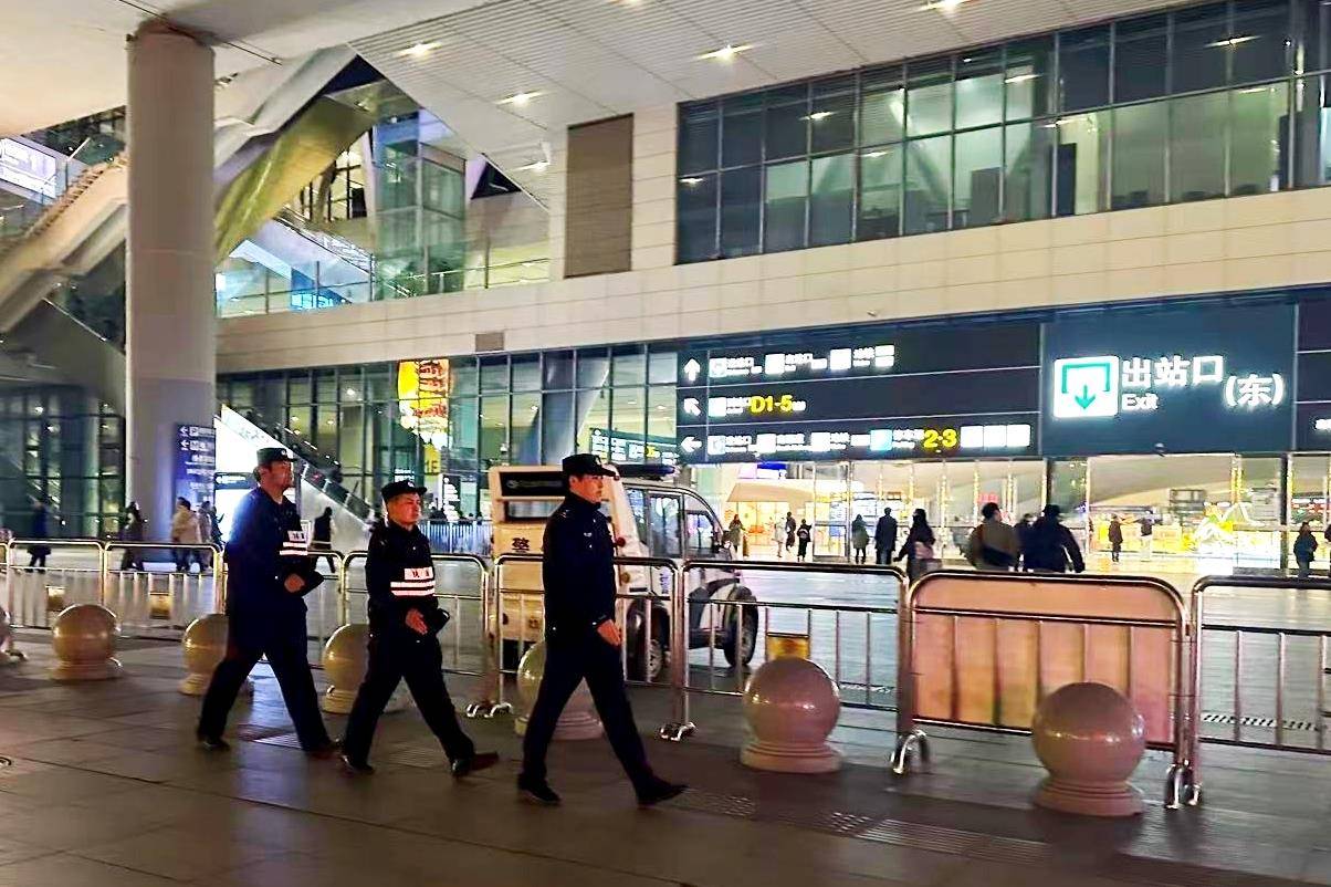 武汉市公安局洪山区分局和平街武汉火车站派出所民警辅警在武汉站东广场开展巡逻。