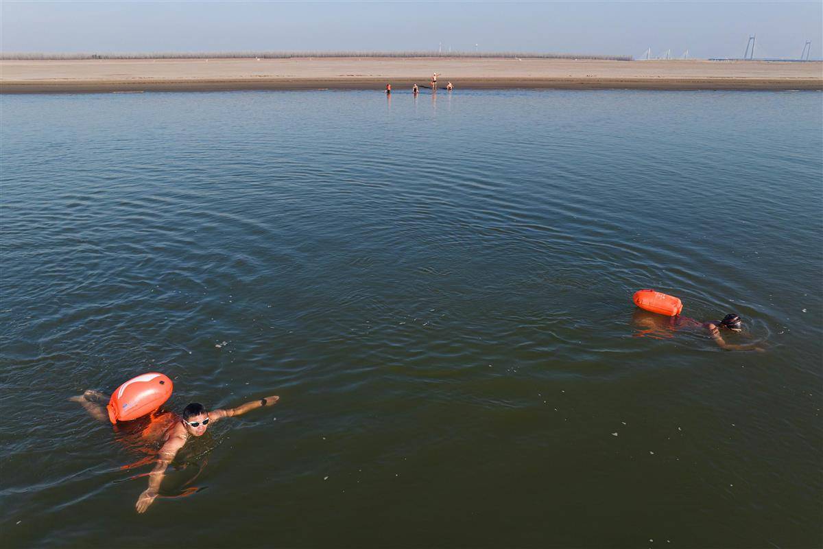 2025年11月30日,岳阳市民在君山区江豚湾景区长江江段游泳。(湖北日报全媒记者 任勇 摄)