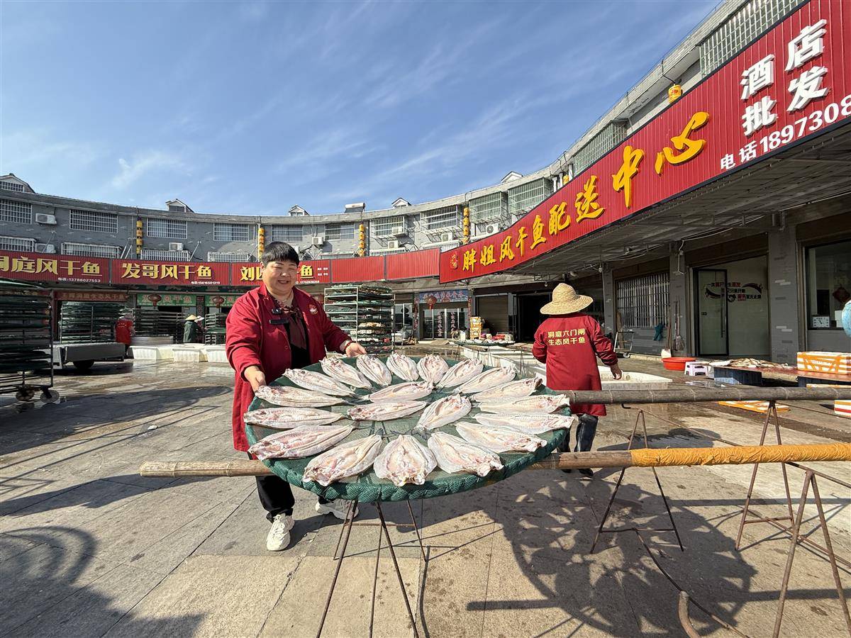 如今,刘晓云网店里所有风干鱼的原料,都换成了这种生态养殖鱼。更让她底气十足的是,2020年“六门闸风干鱼”成功拿下国家地理标志商标,这枚金字招牌成了上岸渔民们的“致富密码”。“你看隔壁‘刘四风干鱼’,我四妹妹现在都要超过我了,一天能卖几吨货!”刘晓云笑着指向不远处的门店,语气里满是骄傲。随着品牌名气越来越大,风干鱼几乎成了家族生意,她的大姐、四妹纷纷入局,刘氏姊妹的风干鱼不仅畅销全国,还从洞庭湖畔一路卖到了柬埔寨。