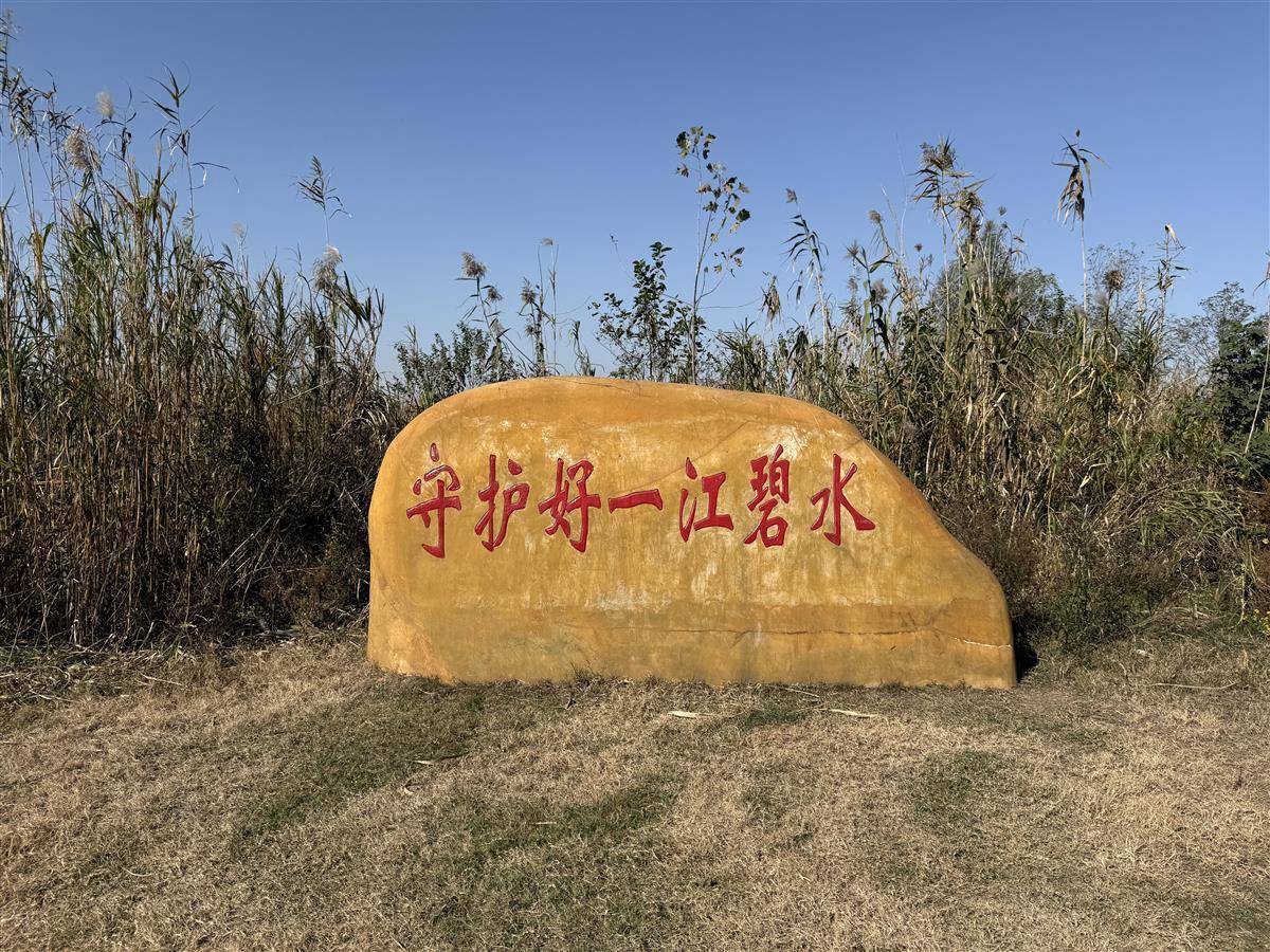 2025年11月30日,在湖南岳阳市君山区江豚湾景区,江畔芦苇场竖立的“守护好一江碧水”石刻。(湖北日报全媒记者 陈莉霖 摄)