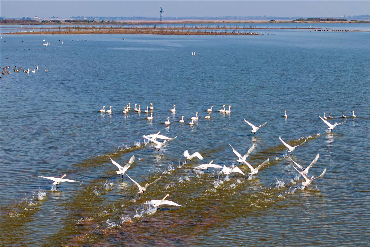 2025年11月30日,在湖南岳阳洞庭湖浅水区域,来自西伯利亚的天鹅在此越冬,数量众多。(湖北日报全媒记者 任勇 摄)