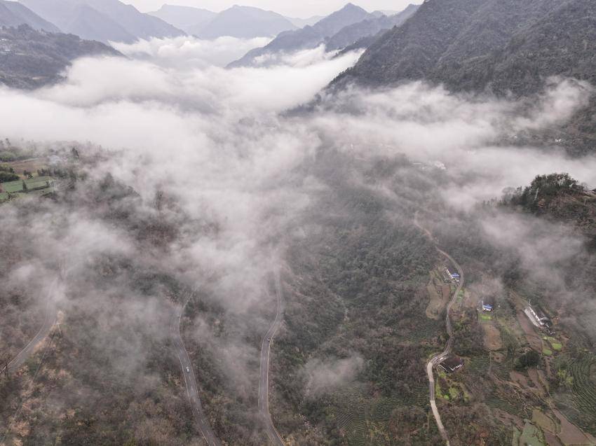 从空中俯瞰,雨后的滩坪村宛如浮升于云海之上的秘境桃源。晨光初露,乳白色的雾气自幽谷升腾,随山势蜿蜒流淌:时而将黛色群峰幻化为“犹抱琵琶半遮面”的朦胧剪影,时而漫过层层叠叠的梯田,使田埂如银线般在雾中若隐若现;村道曲折穿行于云涛之间,时隐时现,恍若通向“云深不知处”的仙踪小径。偶有农舍炊烟袅袅升起,轻融于浩渺云霭中,为这静谧画卷添上一抹温润的烟火气息。