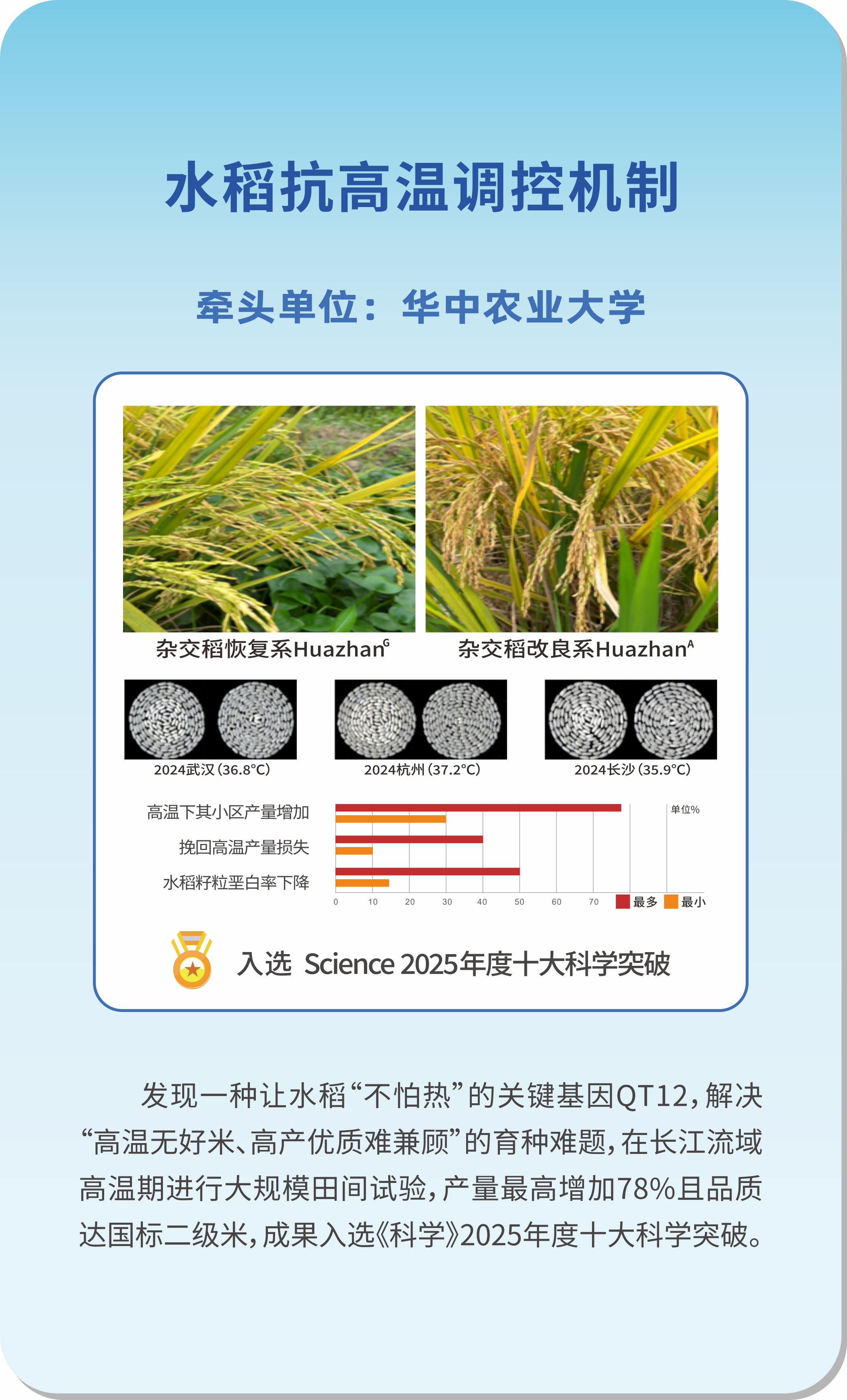 1. 水稻品质与产量协同耐自然高温的机制与应用:攻克“高温无好米、高产优质难兼顾”难题,实现高温下产量与品质双提升。