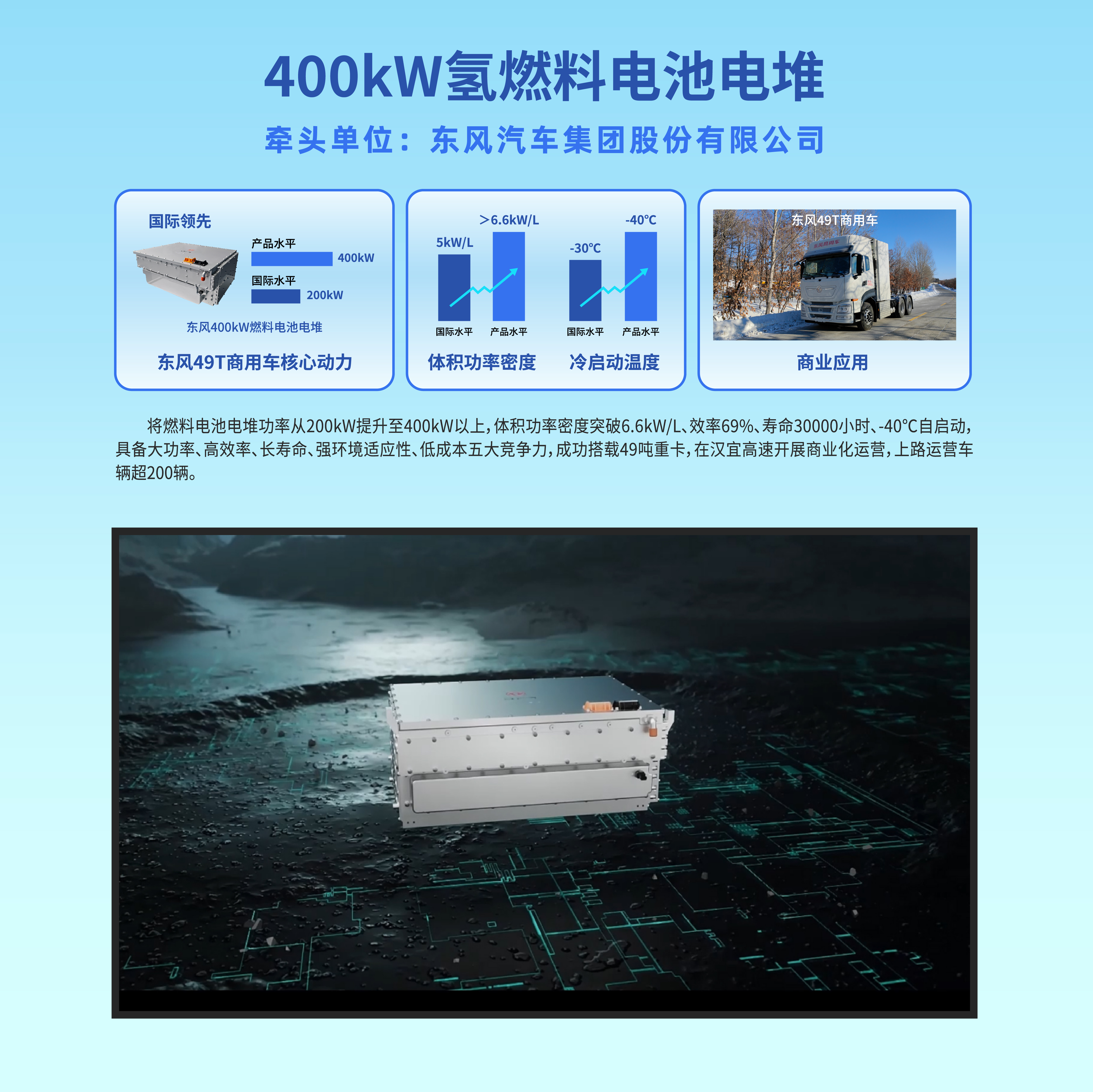18.400kW燃料电池电堆:关键指标国际领先,已成功搭载重卡商业化运营。