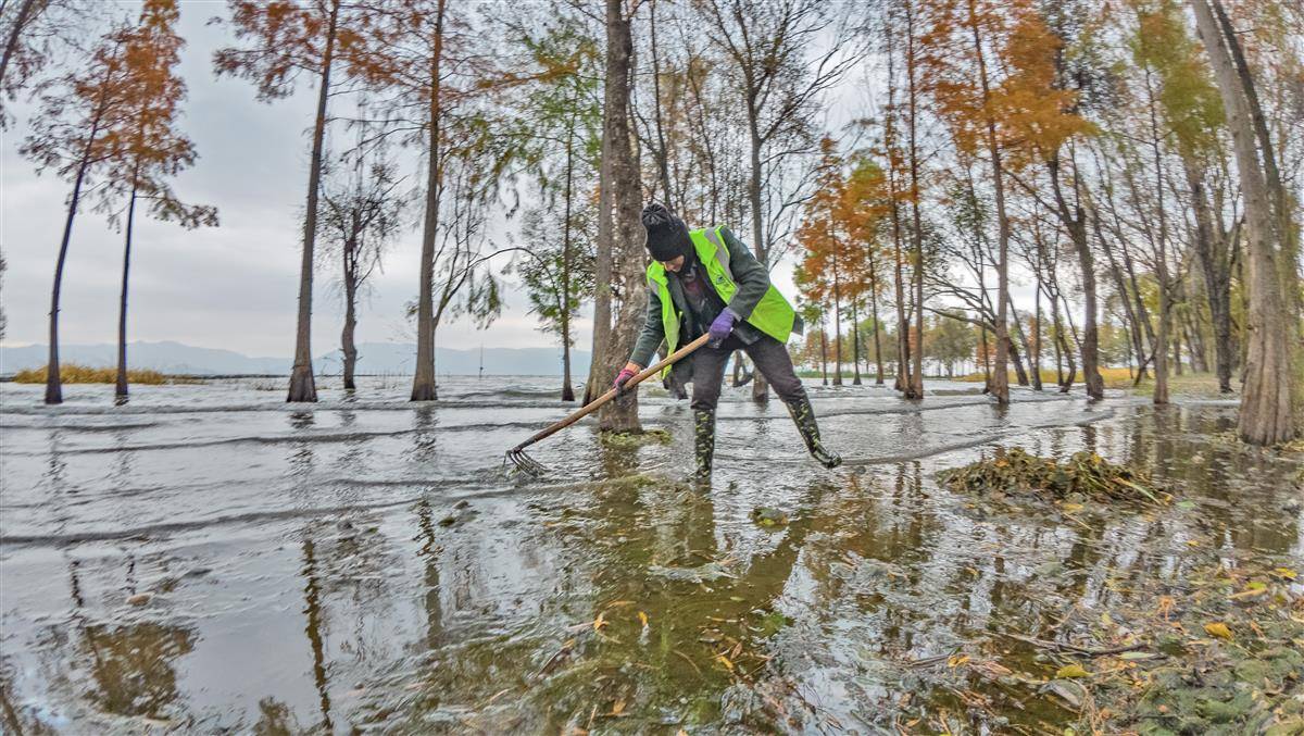 洱海边每天都有工人清漂。(湖北日报全媒记者刘曙松摄)