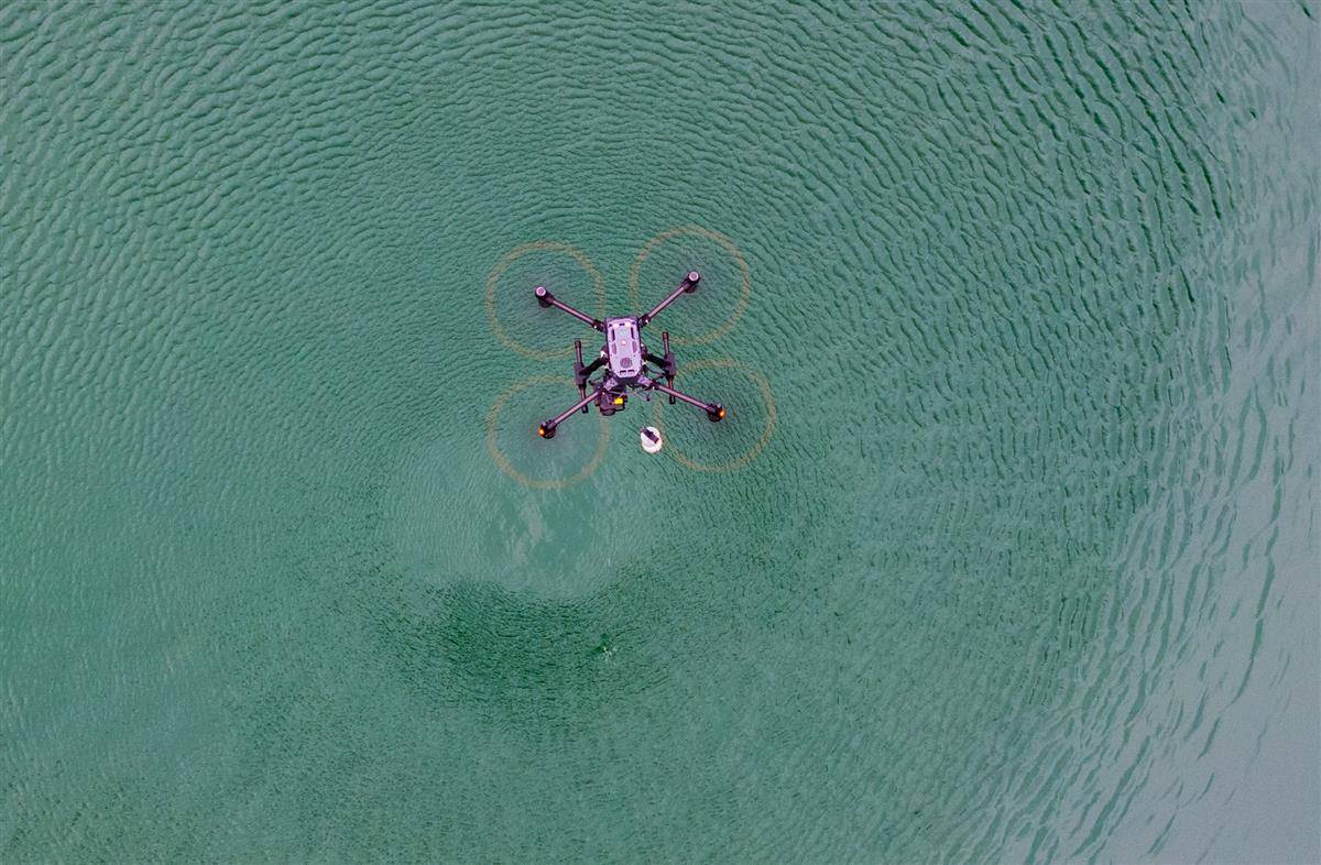 12月2日,贵州省黔西市化屋村六冲河老寨自动监测站外,一架搭载着三个采水器的无人机正在乌江预定点位采样。(湖北日报全媒记者 薛婷 摄)