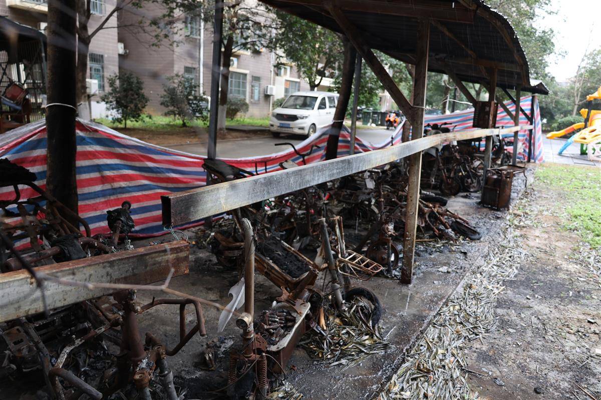 这并非小区第一次因消火栓没水遭遇火灾损失。13栋1单元外,2个停车棚连续两年失火。其中,单元门外20米的停车棚,于2025年10月9日凌晨1时许“火烧连营”,停放的23辆电动车绝大多数只剩下骨架。因赔偿问题谈不拢,触目惊心的火灾现场保留至今。