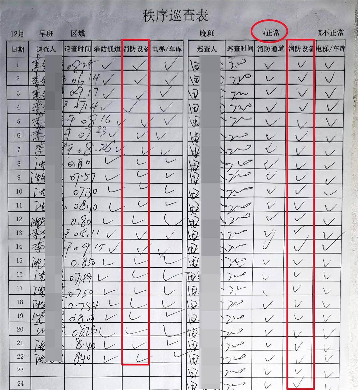 9栋18楼消火栓旁张贴着《秩序巡查表》,表中“消防设备”一栏每天工整地打“√”,即表明设备“正常”。“消火栓长期无水是明摆着的事实,物业却天天打卡,这不是形式主义是什么?”业主江四雨认为有些荒谬。