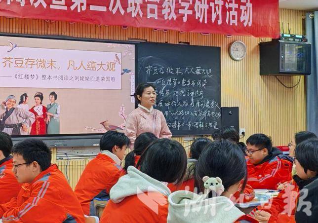 荆州市祝中清名师工作室石首市张锐团队成员、建宁高级中学夏晓绿老师执教第二节展示课《〈红楼梦〉整本书阅读》。她选取“刘姥姥四进荣国府”的独特视角切入,带领学生走进《红楼梦》的宏阔世界。在夏老师的引导下,学生梳理“四进”脉络时,精准捕捉到王熙凤态度的微妙转变,并关联贾府潜藏的经济困境;分析“醉卧怡红院”经典场景时,更犀利指出这一喜剧桥段实则是对贵族精致生活的“温柔颠覆”。夏老师凭借深厚的文学功底从容驾驭课堂,让学生在品读文本中真切体会人情冷暖、世态炎凉,深刻感悟小说“草蛇灰线,伏脉千里”的精妙结构艺术。这一切入点“小而巧”,如同一把钥匙,为学生打开了理解人物命运与时代悲剧的窗口,引导高中生“走近经典、读懂经典”。
