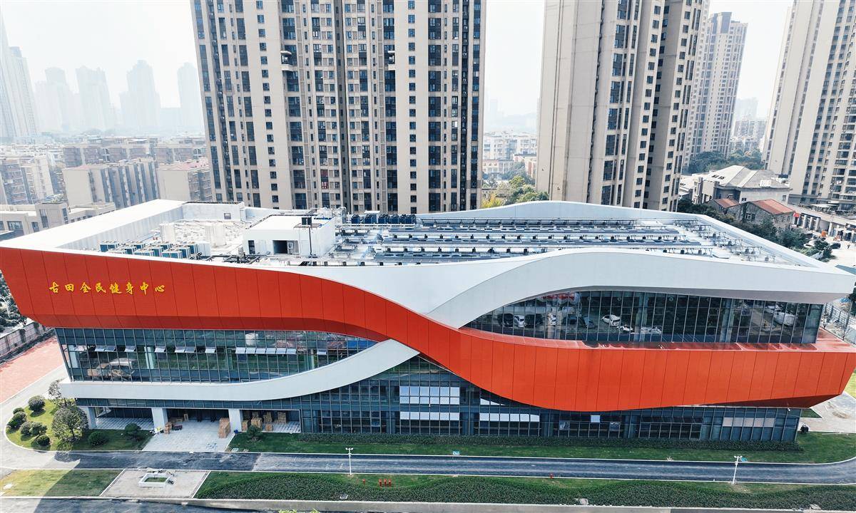深冬的硚口区,汉江湾古田全民健身中心的玻璃幕墙在阳光下熠熠生辉。工人们正在进行最后的幕墙清洁工作,不远处的室外区域,园林工人正在栽种银杏与桂花树。